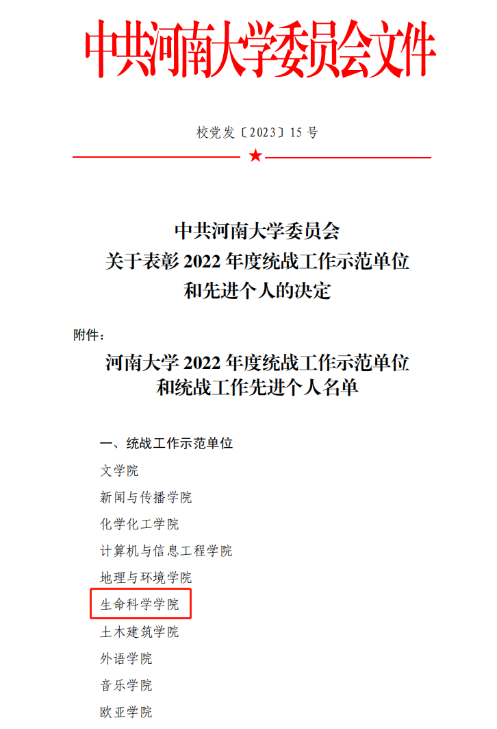 近日,中共河南大学委员会下发《关于表彰 2022年度统战工作示范单位和先进个人的通知》(校党发〔2023〕15号)文件,学院党委被授予“河南大学2022年度统战工作示范单位”荣誉称号。