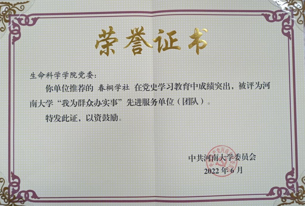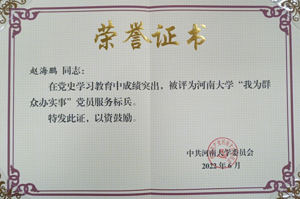 在“我为群众办实事”实践活动先进典型表彰中,我院党委荣获河南大学党史学习教育优秀组织奖,春桐学社荣获河南大学“我为群众办实事”先进服务团队,赵海鹏同志荣获河南大学“我为群众办实事”党员服务标兵。