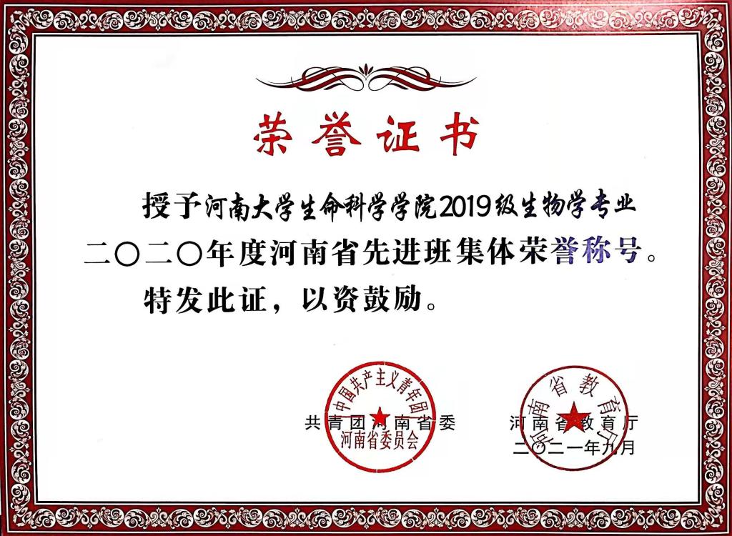 在生活建设方面,班级同学在学习上互相帮助,生活上互相关心,思想上互相进步。在学习学风方面,2019级生物学专业学习风气浓厚,每天埋头于实验室,努力提升科研能力。我班同学共发表SCI论文13篇,中文核心2篇。目前为止有五位名同学荣获国家奖学金、所有同学均荣获过河南大学硕士研究生学业奖学金。本次评比中,我班两位同学分别荣获了河南省三好学生优秀学生干部的荣誉称号我班于2020年获得河南大学研究生先进班集体称号,于2021年获得河南省先进班集体称号。