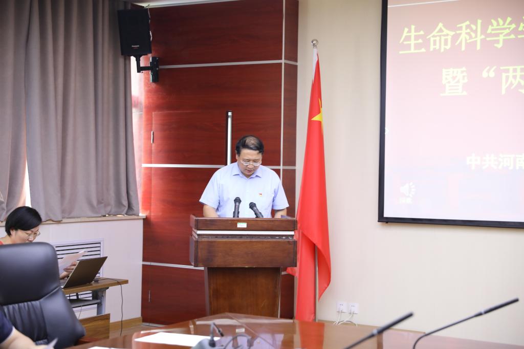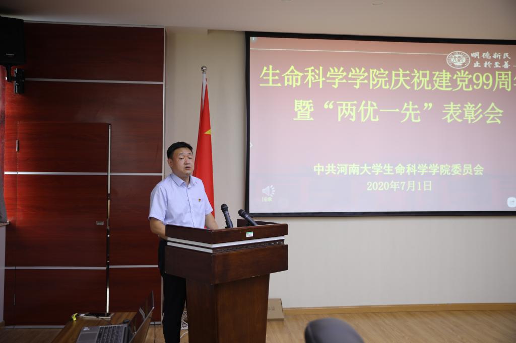 学院党委书记赵东保向获得表彰的集体和个人表示祝贺,向辛勤工作的全院师生致以敬意。他在讲话中回顾了党的光辉历程和丰功伟绩,要求全体党员要坚定理想信念,以习近平新时代中国特色社会主义思想为指导,把思想和行动统一到党中央决策部署上去,集中精力办好教育事业,全力以赴建设好一流学科。“党的建设是学院各项事业不断取得进步的思想基础和组织保障”,赵东保在讲话中强调,要进一步全面加强基层党的建设,完善基层党组织的领导体制,学院党委、各党支部要严格按照新时代党的建设总要求,坚持培育为基、重在建设、典型引领、整体推进,以政治建设为统领,以质量攻坚为动力,以提升组织力为重点,以推动事业发展为落脚点,对标看齐,改革创新,为加快“双一流”建设、实现内涵式发展提供坚强的组织保证。他希望广大党员要有新担当、新作为,大力弘扬“脚踏实地、奋发有为”的精神,在自己的岗位上发扬传统、踏实肯干,投身在“进行伟大斗争、建设伟大工程、推进伟大事业、实现伟大梦想”的历史进程中,勇担使命、大有作为,以一流学科建设为契机,不断开创生命科学学院改革发展新局面。