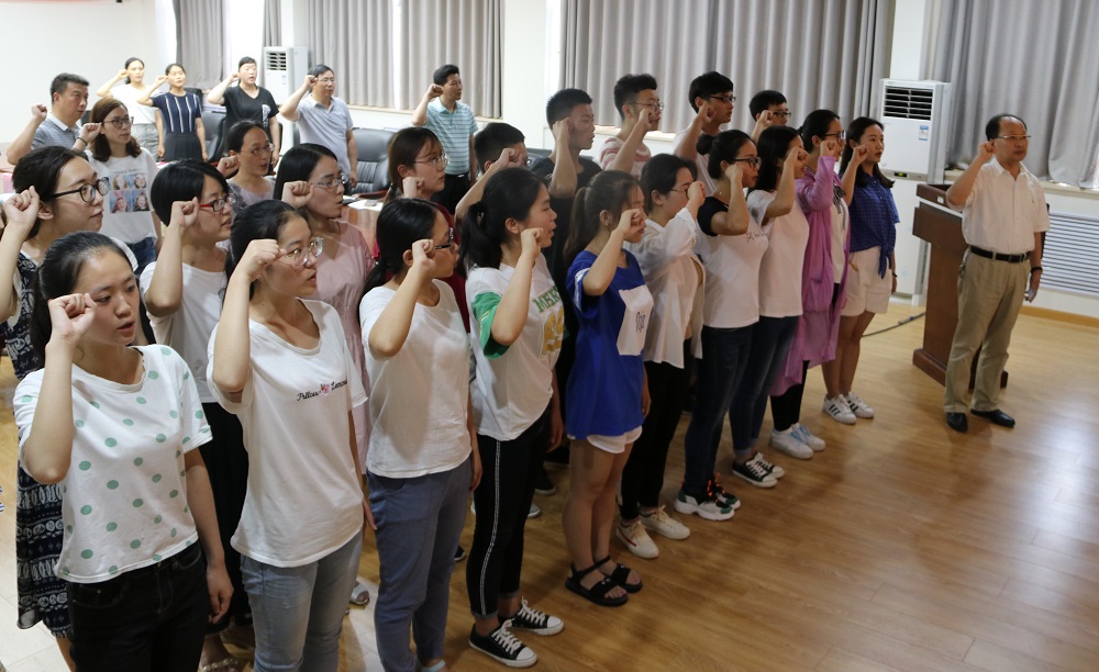 6月25日,在学院B201会议室举行党员宣誓仪式。院党委委员、各党支部书记、新入党党员及部分毕业生党员代表参加宣誓。河南大学优秀共产党员、生物工程系主任杨生玉教授带领全体党员庄严宣誓,新生党员入党宣誓、老党员重温入党誓词。面向鲜红的党旗,高举右拳,字字铿锵有力,句句掷地有声,凸显共产党员的忠诚与信仰。新生党员代表石俊平作“不忘初心、牢记使命”主题发言:作为学生党员,传承红色历史基因,自觉增强自身综合素养,发挥先锋模范作用,做有理想有担当的接班人。
