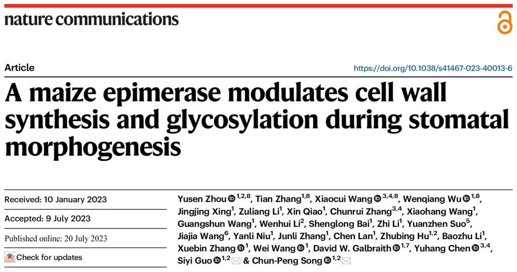 7月20日,河南大学生物学学科带头人宋纯鹏教授及其课题组在玉米哑铃形气孔形态建成的机制方面取得突破性进展,研究成果“A maize epimerase modulates cell wall synthesis and glycosylation during stomatal morphogenesis”发表在著名期刊Nature Communications上(DOI: 10.1038/s41467-023-40013-6)。