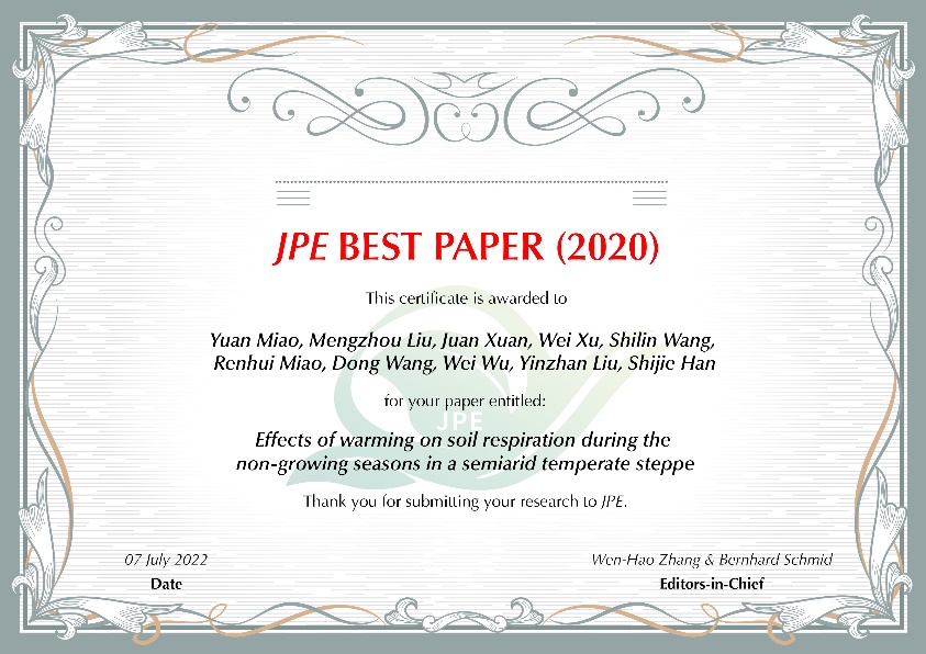土壤碳排放:实验室成员依托非对称性增温实验平台,研究了非生长季增温对温带半干旱草原土壤呼吸的影响,发现:①土壤温度、 微生物生物量碳和氮的变化调控了土壤呼吸对模拟增温的响应; ②草地植物群落结构和组成对生长季后期干旱响应大于前期干旱的响应。研究成果分别发表在Journal of Plant Ecology和Journal of Vegetation Science上,苗原副教授和苗仁辉副教授分别为论文第一作者。其中,苗原副教授的论文获得Journal of Plant Ecology 2022年度最佳论文奖。