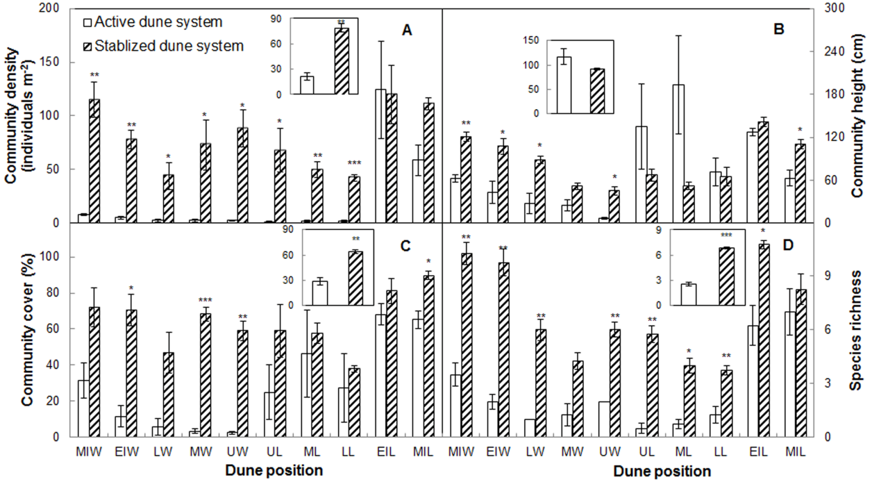 图3. 长期禁牧对不同沙丘系统位置植物群落密度、高度、盖度和物种丰富度的影响