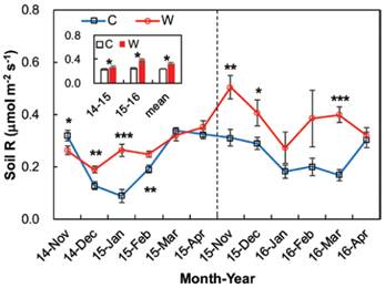 图2. 非生长季增温处理对月平均动态土壤呼吸(插图为年平均值)的影响