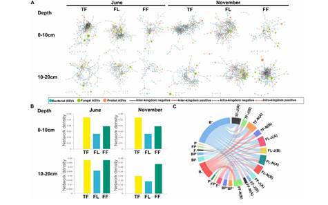 土壤微生物群落构建:实验室成员调查了黄河中下游嫩滩、农田和弃耕地三类土地利用类型下细菌、真菌和原生生物群落构建过程和共生网络模式的差异,发现:①相比于微生物α多样性 指数,微生物群落的组成和结构更容易受土地利用类型的影响; ②微生物群落结构的变化与土壤肥力的差异有关。在嫩滩和弃耕地,随机过程对细菌、真菌和原生生物群落构建的贡献高于农田; ③在这三种土地利用类型中,嫩滩土壤微生物网络最稳定,而弃耕地的微生物网络最不稳定。研究结果为滩涂生态系统的可持续管理和保护提供科学依据,并分别发表在国际知名期刊Applied Soil Ecology和Journal of Plant Ecology上,实验室博士后余炎炎和博士生董雄德分别为论文第一作者。