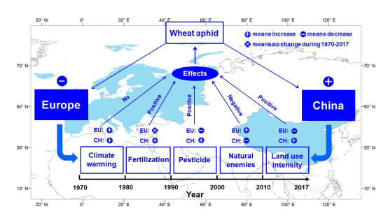 图1. 1970-2017年中国和欧洲麦蚜种群动态变化及相关影响因子的概念图