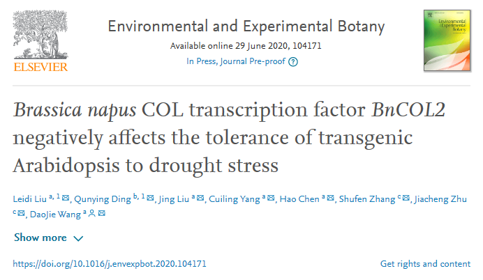2020629日,生命科学学院/省部共建作物逆境适应与改良国家重点实验室王道杰课题组在Environmental and Experimental Botany 在线发表题为Brassica napus COL transcription factor BnCOL2 negatively affects the tolerance of transgenic Arabidopsis to drought stress”的研究论文。本研究通过对油菜FOX拟南芥库进行筛选与鉴定,得到干旱响应关键基因BnCONSTANS-LIKE2BnCOL2,进而揭示BnCOL2可能通过影响ABA信号通路及干旱胁迫相关基因的表达负调控植物对干旱胁迫的耐受性。