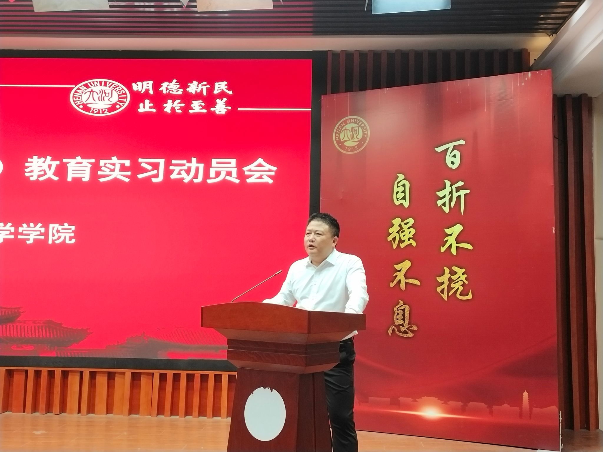 颁奖仪式结束后的教育实习动员大会上,副院长赵海鹏作教育实习动员并提出了具体要求:牢记习近平总书记对人民教师殷切嘱托,遵守学院和实习学校的要求,到实习学校后要调整角色,言行举止要符合人民教师职业规范,并在实习和以后的工作中,落实“一践行三学会”新时代教师专业发展的新要求,努力成为一个让学生认可为“遇到就是人生幸运”的好老师,5所实习高中教师代表分别介绍了各自学校和生物学教研组的情况,并对我院师生前往开展实习表示欢迎;肖保林对实习进行了具体工作安排情况;本科生韩建琛作代表实习生发言,表达了师范生将承扬师范精神,出色完成实习工作的愿景与决心。动员会由刘凌云主持。