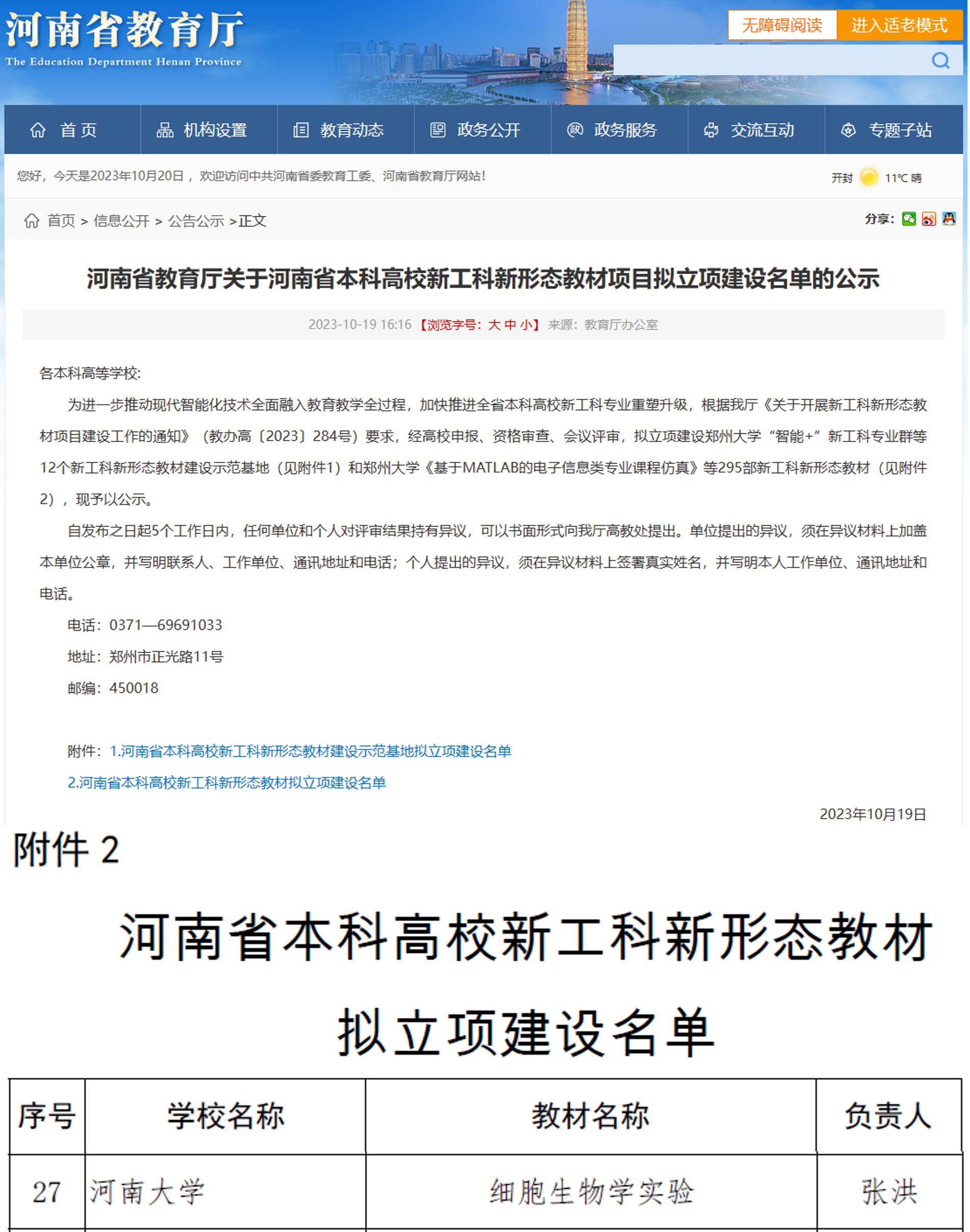 近日,河南省教育厅关于河南省本科高校新工科新形态教材项目拟立项建设名单的公示,生命科学学院张洪副教授主编的《细胞生物学实验》获批立项建设。