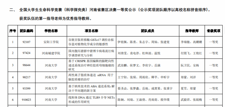 “亚热带暖温带森林不同火烧强度对土壤线虫的影响”“GhHSFA2-1参与调控棉花热记忆的机制”系国家一等奖(省级特等奖)项目,前者由苗原老师指导姚宇腾小组完成,以探究不同火烧强度与土壤线虫之间的关系为目的,解决了火烧对亚热带暖温带森林地下食物网的影响问题,为火后森林生态系统的修复提供了科学依据与理论支撑;后者由何世斌老师指导姚易含小组完成,从分子水平和表观遗传等方面探究GhHSFA2-1调控棉花热记忆的分子机制,为提高棉花耐热性提供新的思路。生命科学学院获得国家二等奖(省级一等奖)的项目为“两性离子脂质体递送siRNA用于脑胶质瘤的治疗”和“基于纳米技术的ABA递送系统:解决干旱问题的新方案”,分别由郑蒙老师指导王宁阳小组、夏雪老师指导蔡圣垚小组完成。上述指导教师被大赛授予“优秀指导教师”称号。
