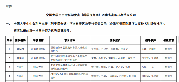 近日,全国大学生生命科学竞赛(2024,科学探究类)河南省赛区决赛在周口师范学院成功闭幕,比赛首次采取省赛、国赛二合一的方式进行。经过网络评审、参赛项目PPT展示、选手答辩、专家评审等环节,河南大学共荣获国家一等奖(省级特等奖)2项、国家二等奖(省级一等奖)4项、国家三等奖(省级二等奖)14项和省级三等奖17项,同时获优秀组织奖;上述奖项中,包含生命科学学院国家一等奖(省级特等奖)2项、国家二等奖(省级一等奖)2项、国家三等奖(省级二等奖)9项和省级三等奖11项。