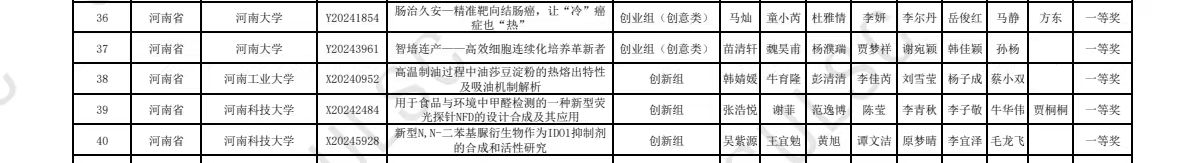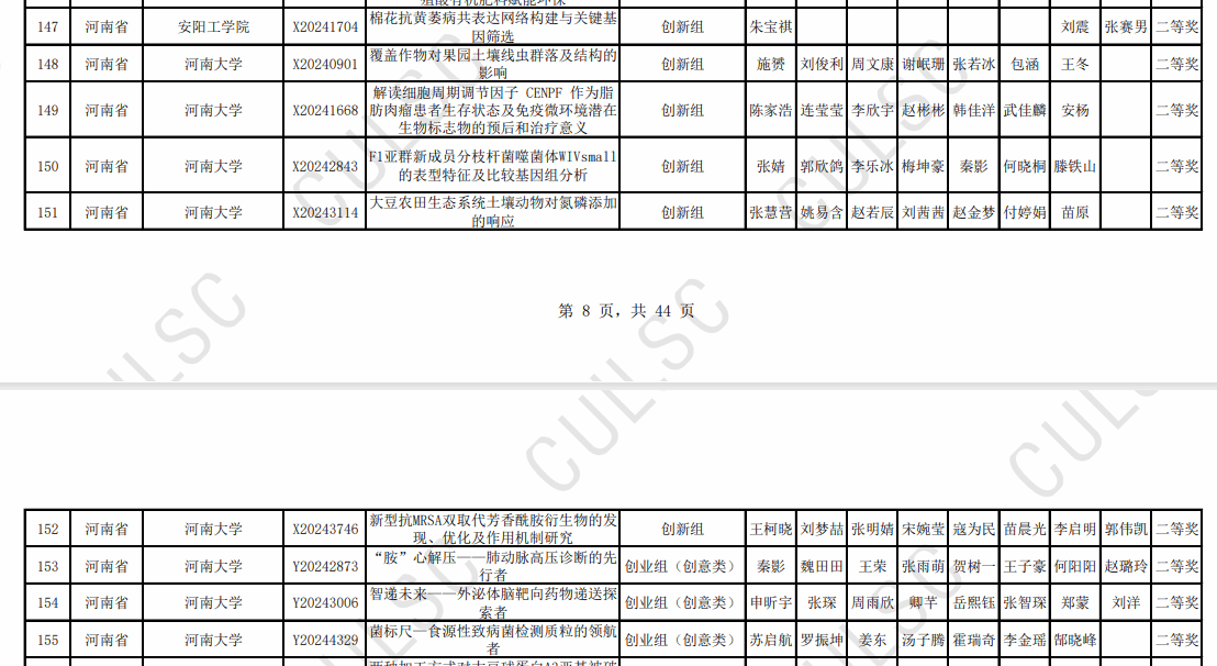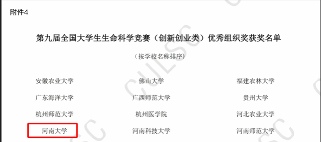 近日,全国大学生生命科学竞赛(2024,创新创业类)决赛在西华大学郫都校区成功举行。本届大赛共有来自全国535所高校的6676支团队参加,前期经过资格审查、网络评审、省赛等环节,共评选出484项参赛项目进入全国决赛。经过激烈角逐,河南大学获得一等奖2项,二等奖8项,三等奖9项,被授予优秀组织奖,其中生命科学学院共获得国家一等奖1项、二等奖4项、三等奖1项。