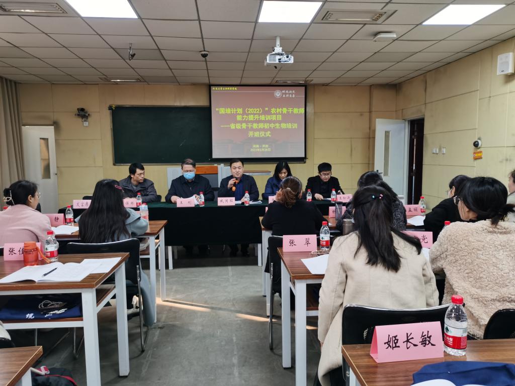 2月28上午9点,河南大学“国培计划(2022)”—农村骨干教师能力提升培训项目省级骨干教师培训初中生物培训班在生科院B101教室正式开班。生命科学学院党委副书记、执行院长王刚教授,副院长臧国轻,院办公室主任王松廷,院成教办主任李黎,生物科学系副主任肖保林,项目课程负责人张彤,班主任张先莽,王茹等项目组成员和50名来自全省各地的初中生物教师学员参加了开班仪式,仪式由学院副院长臧国轻主持。