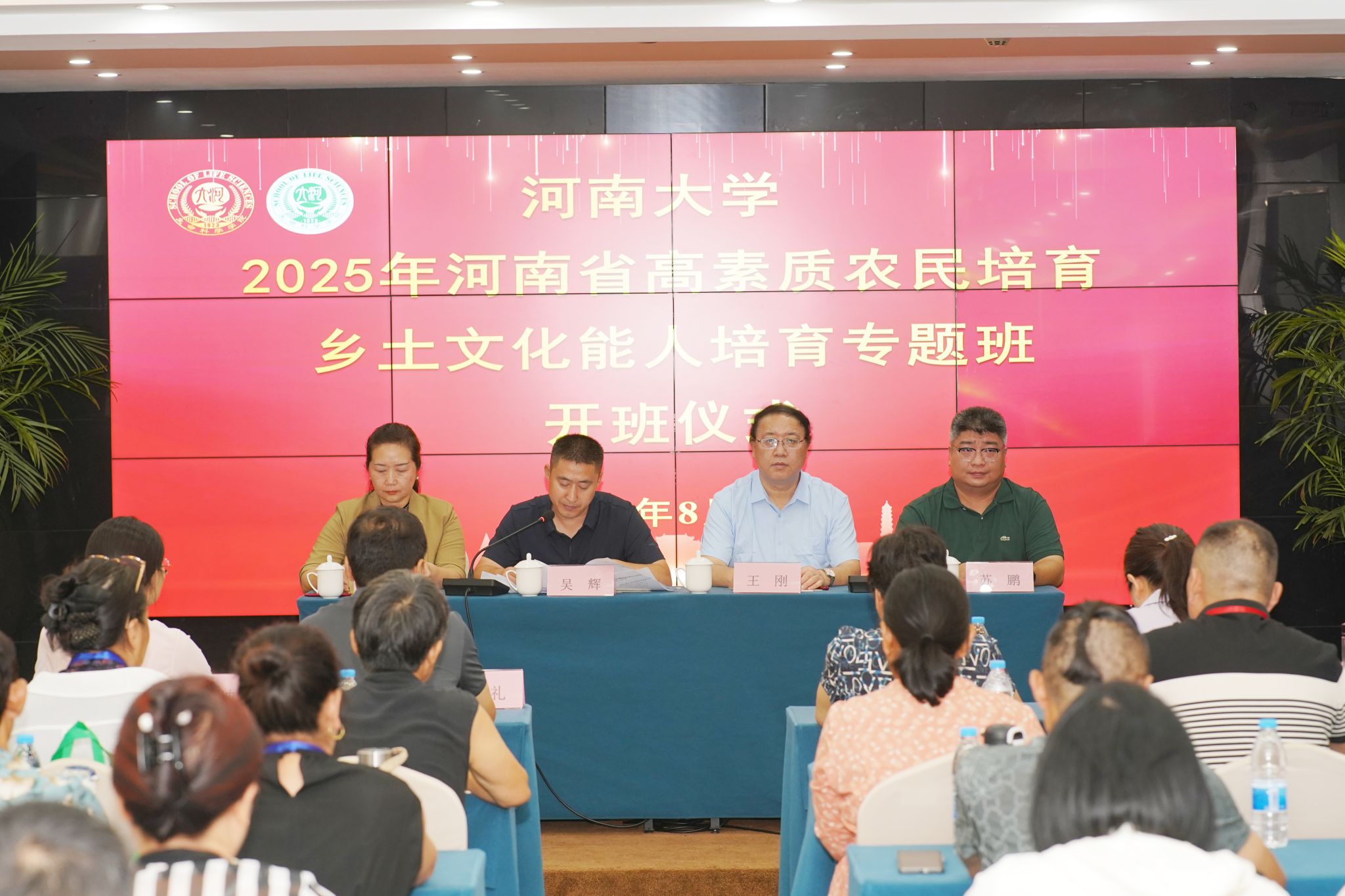 为深入贯彻落实乡村振兴战略,加强乡村文化人才队伍建设,2025年8月2日上午,由河南省农业农村厅主办、生命科学学院承办的“河南省乡土文化能人高素质农民培训班”开班式在开封燕通国际酒店隆重举行。来自全省各市县的100名学员参加培训。河南省农业农村厅科技教育处副处长吴辉,生命科学学院执行院长王刚,开封市文物保护管理二所、市文物和文化遗产保护志愿服务计划宣讲员刘荣等出席开班式。开班式由生命科学学院副院长苏鹏主持。