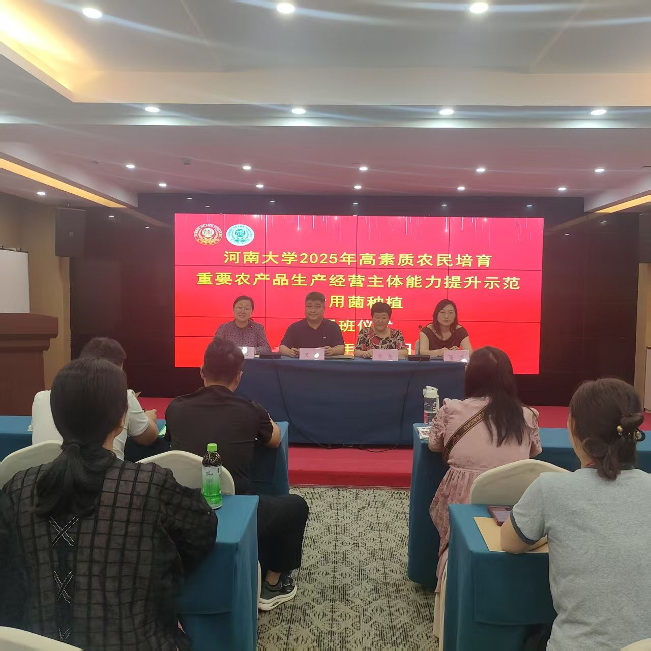 8月5日下午,河南大学2025年高素质农民培训班——重要农产品生产经营主体能力提升示范(食用菌种植班)开班式在开封燕通国际酒店隆重举行。生命科学学院副院长苏鹏、成教办负责人李黎、教师代表董薇、培训班课程负责人苏亚蕊以及来自全省各市县的50名学员参加了开班式。开班式由苏亚蕊主持。