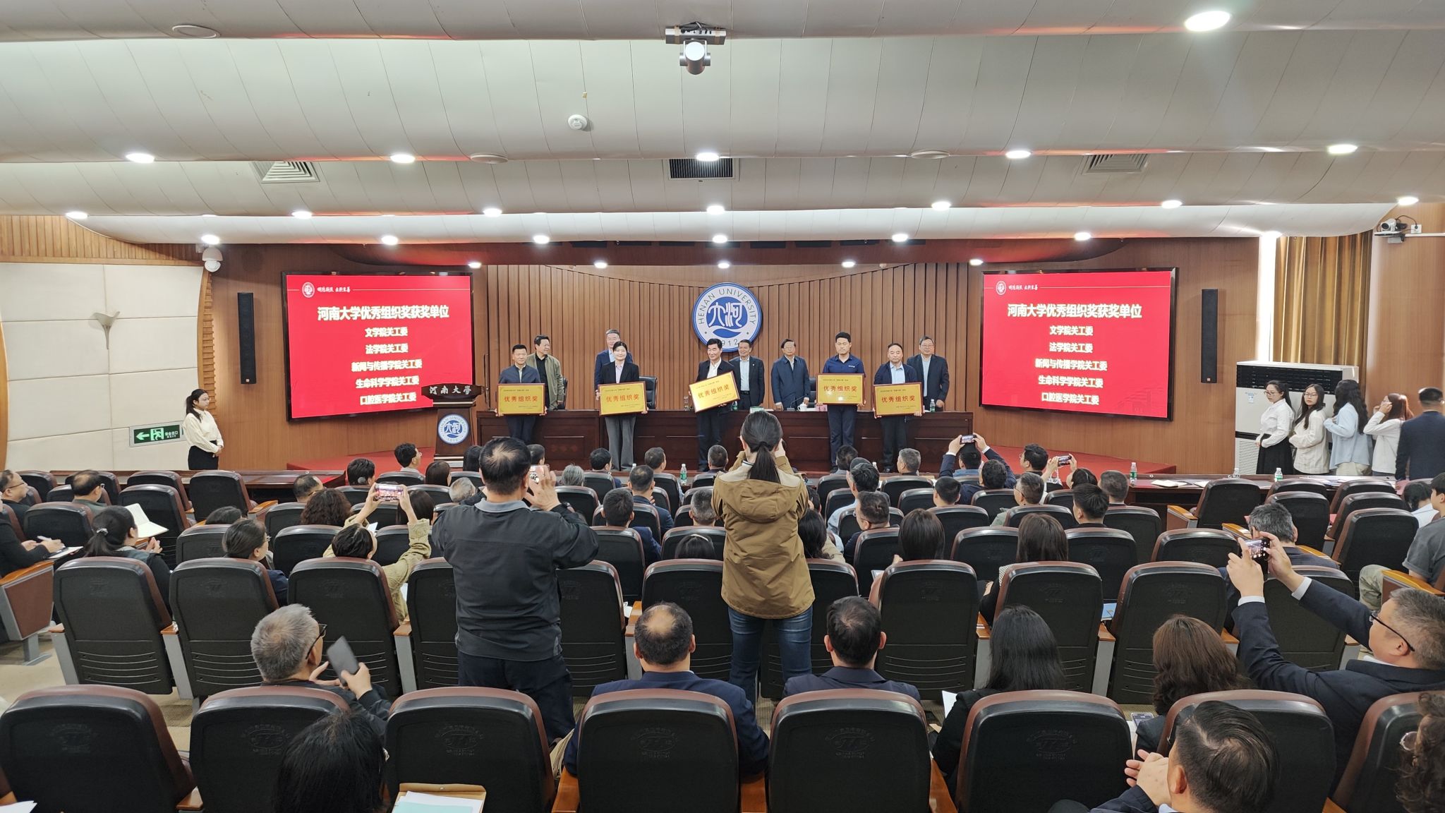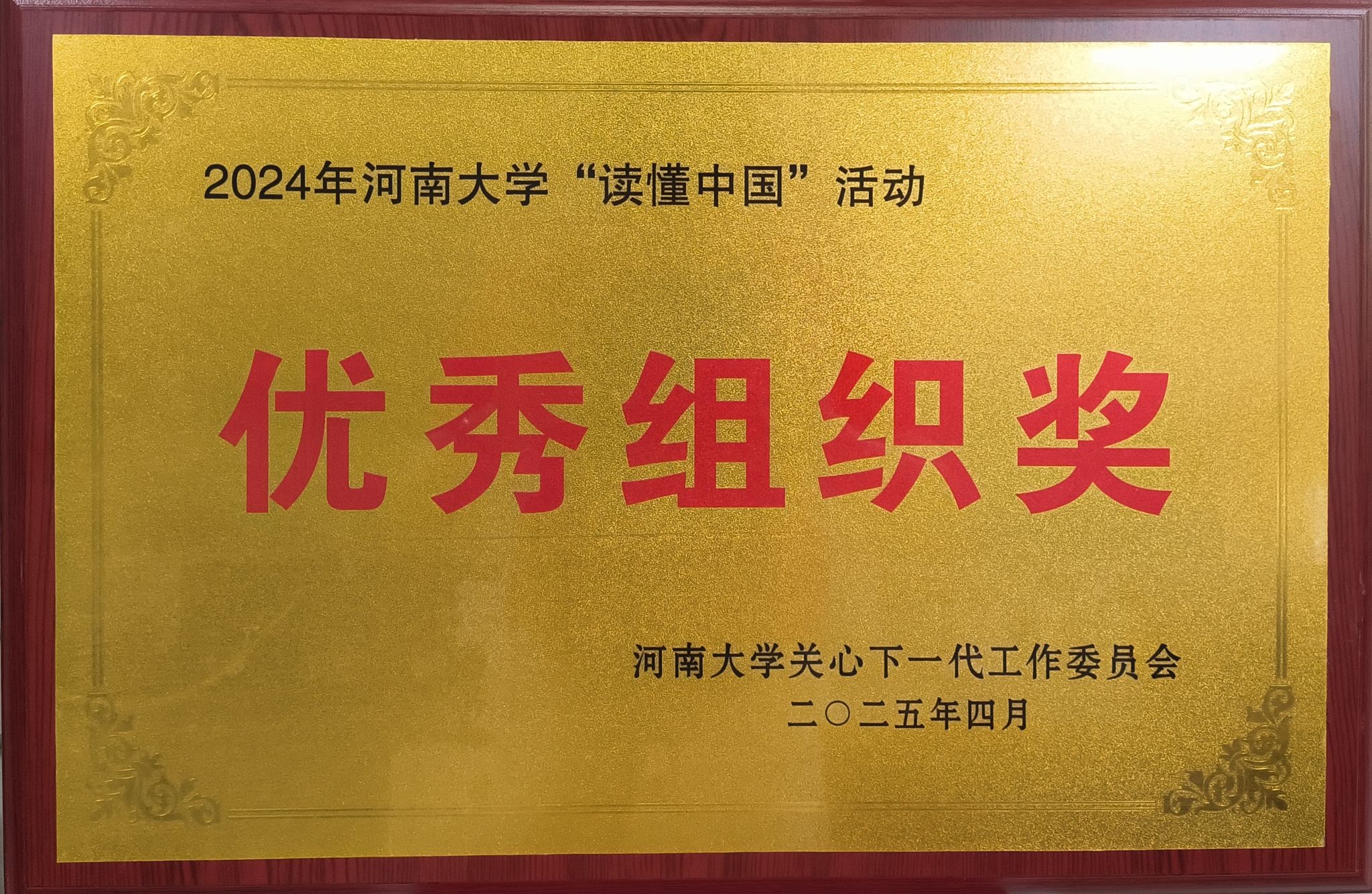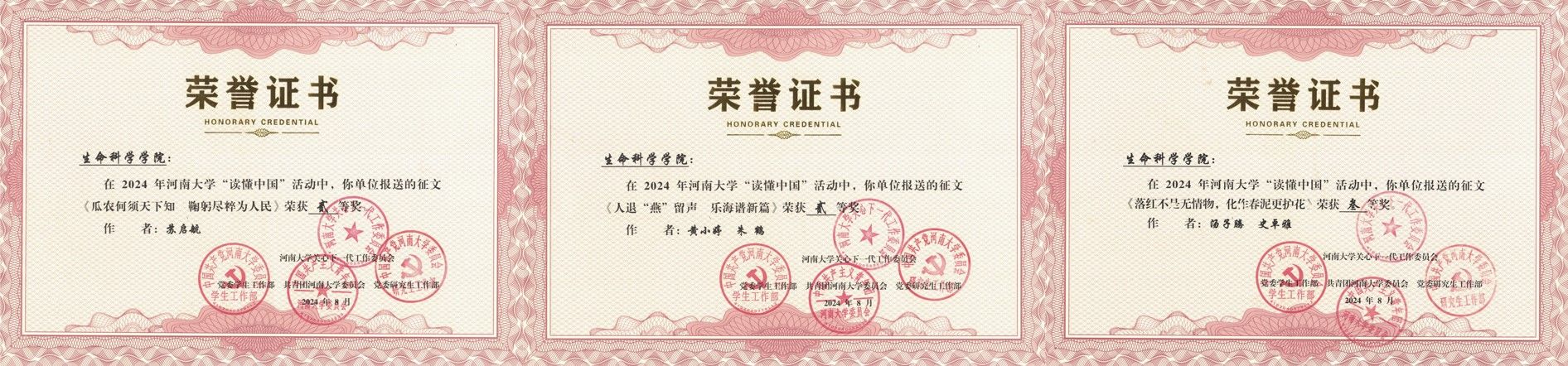 近日,河南大学召开2025年关工委工作会议,会上对2024年度“读懂中国”活动优秀组织单位和获得教育部、省教育厅奖励的个人进行表彰。其中,生命科学学院荣获优秀组织奖,本科生黄小婷、朱鹤、苏启航的作品获得征文组二等奖,本科生汤子腾、史卓雅的作品获得征文组三等奖。