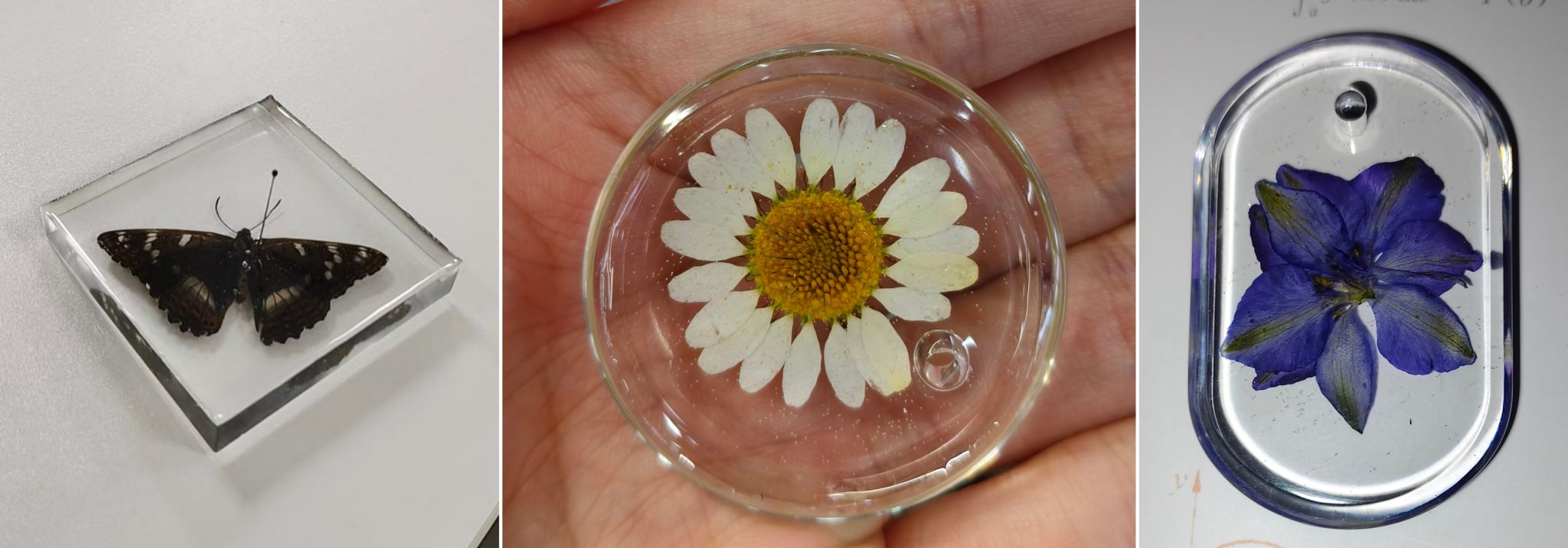 在制作环节,同学们分组进行琥珀制作,大家分工协作,志愿者现场指导同学们如何做好“胶水量控制”“标本固定角度”。有的小组精心设计,将干花与蝴蝶标本巧妙搭配,让琥珀仿佛封存了一个微观的梦幻花园;有的小组则发挥奇思妙想,用不同形状的模具打造出独一无二的琥珀造型,每一件作品都承载着大家对新环境的期待与对大学生活的美好憧憬。活动现场欢声笑语不断,随着一件件精美的琥珀标本在同学们手中诞生,大家的脸上洋溢着自豪与满足的笑容。