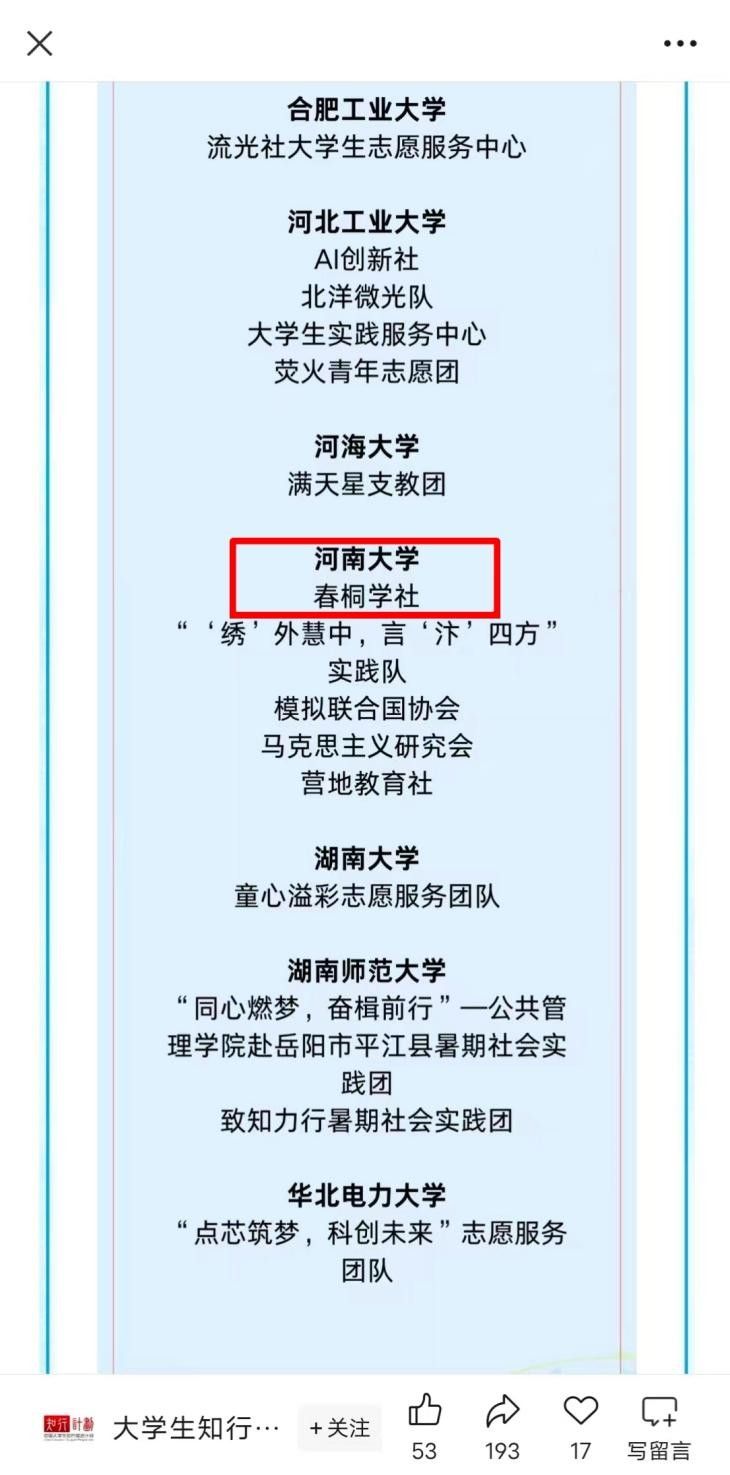 近日,在2025年“国际志愿者日”来临之际,中国大学生知行促进计划与青年影响力创新中心共同发布了2025年“榜样100”全国优秀大学生社团榜单。河南大学春桐学社脱颖而出,获评“全国优秀大学生社团”称号。