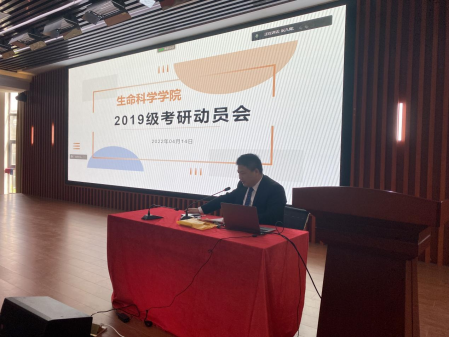 为充分调动同学们的考研积极性,更好的挖掘自身潜能,把握深造机会。生命科学学院于4月14日在圆形报告厅三楼举办了学生考研动员大会。学院党委副书记程亚敏、副院长赵海鹏出席大会,大会邀请到2018级保研到北京大学、南开大学、厦门大学的李印、李晔、颜永祺同学,以及考研至中国科学技术大学、华中科技大学、中山大学的汪菡茜、王雪、张朋磊同学介绍经验。动员交流会由2019级本科生辅导员阮九霄老师主持,学院本科生辅导员以及2019级、2020级和2021级全体本科生参加,交流会采取线上和线下相结合的方式召开。