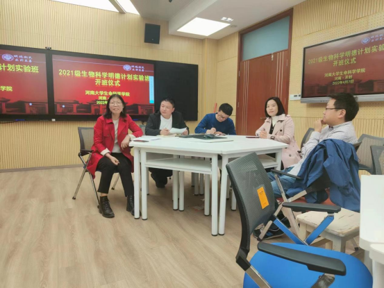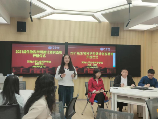 47日下午,2021生物科学明德计划实验班”开班仪式在学院智慧教室举行该级所有班级成员,学院副院长赵海鹏、李志芳,教师代表陈敏教授,生物科学系主任刘凌云、教务办主任张要军、2021辅导员张茜茜,2018级明德班优秀毕业生李晔等参加仪式,仪式由赵海鹏主持。