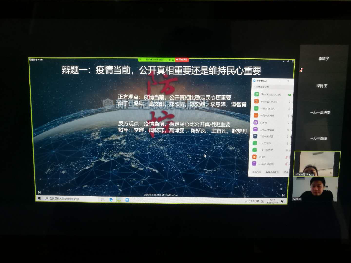 2020年2月18日上午10点,开云kaiyun网页版官网18级明德班利用Zoom平台,举办了“反思疫情,明德先行”线上辩论赛。围绕“新型冠状病毒的出现是好事还是坏事”和“公开疫情真相重要还是维持民心重要”两个论题展开激烈辩论。生命科学学院副院长赵海鹏、学院拔尖人才培养和国际交流办公室主任李志芳、2018级辅导员李靖宇担任比赛评委,王泽楠同学主持辩论会。