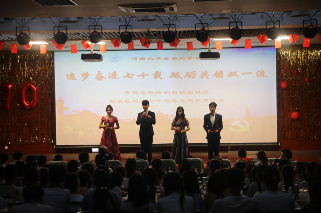 追梦奋进七十载,砥砺共铸双一流。5月26日晚,生命科学学院在圆形报告厅三楼举办青马工程培训班结业仪式暨“庆祝建国七十周年”主题教育晚会。河南大学党委宣传部副部长何威,河南大学党委学生工作部副部长、学生处副处长肖艳,生命科学学院党委书记赵东保、党委副书记张亚歌、副院长王道杰,学院外籍教师、法国南巴黎大学Michael DuBow 教授夫妇及其他教师代表莅临现场,近四百名本科生、研究生参加晚会。