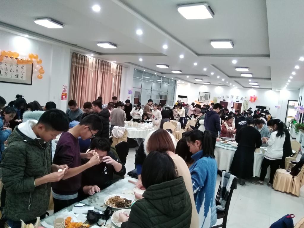 缇室葭灰微动候,围炉娇耳始添时。在我国北方,冬至有吃饺子的习俗,寓意着生活的圆满和美好,同学们也积极组队,充满创意的取名为阖家欢队、大小吃货队、冬饺小将队、我全都要队等。活动现场其乐融融、春意盎然,欢声笑语中,同学们各显身手,小小的面团在擀面杖下飞快的旋转,一会儿就神一般地变成了一张张又薄又圆的面皮,包饺子的同学也不遑多让以迅雷不及掩耳之势捏出一个个饱满精致的饺子,扇形的、麦穗形的、元宝形的,一排排饺子像整装待发的士兵精神抖擞的排列在一起。有的学生是第一次动手包饺子,专门搜了网上的视频教程学习,有的同学还把巧克力、小橘子、小糖果包到饺子里,他们说,“我们是把幸福和甜蜜包到饺子里!”,“谁吃到保佑谁期末考试不挂科”邬娜快乐的说道。