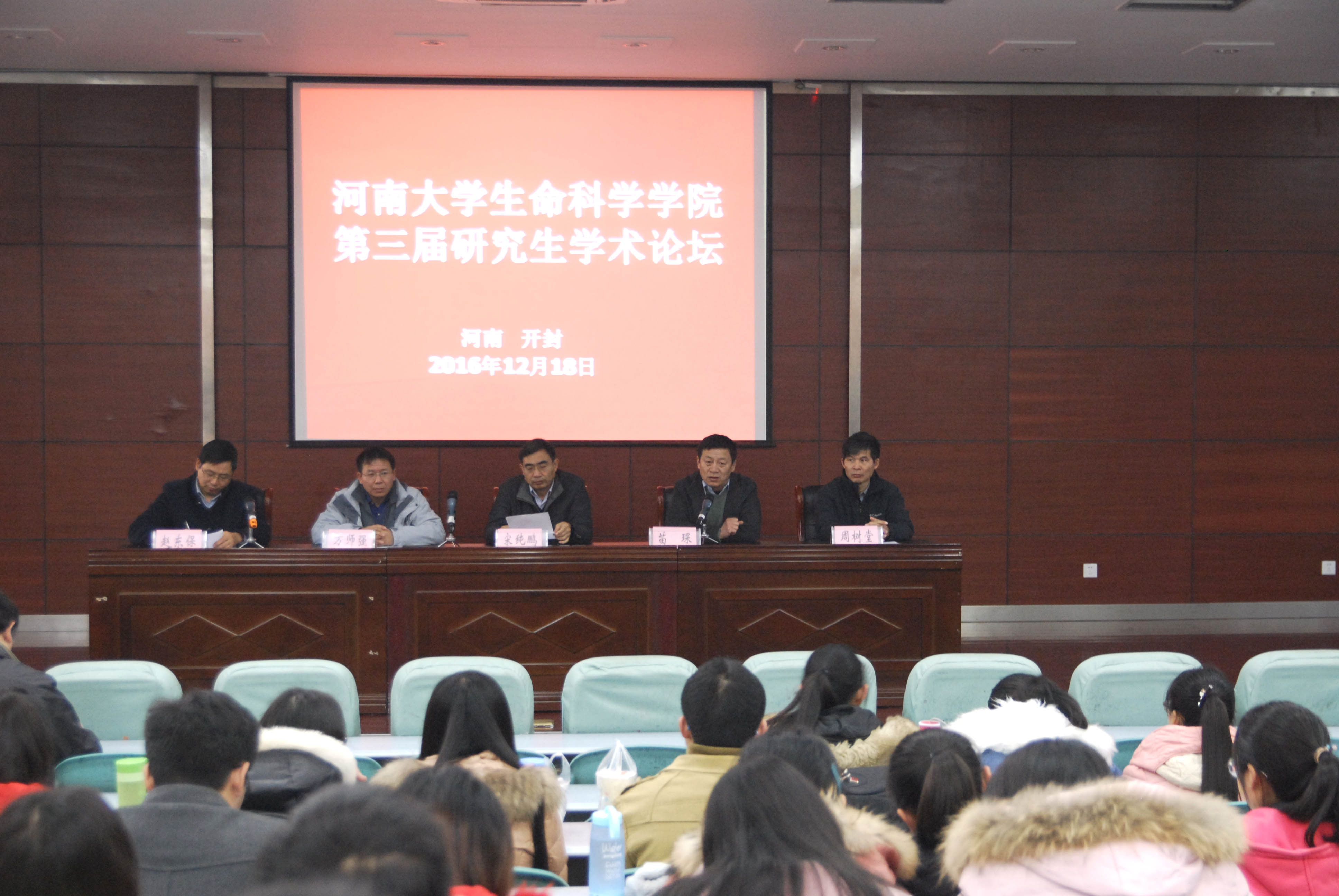 为搭建研究生学术交流平台,激发科研灵感,碰撞学术思想,提升研究生科研素养,2016年12月18日,生命科学学院举办第三届研究生学术论坛。河南大学副校长宋纯鹏教授、研究生院常务副院长苗琛教授、生命科学学院班子成员、研究生导师、青年骨干教师以及研究生300余人出席了会议,学术论坛开幕式由院党委书记赵东保教授主持。