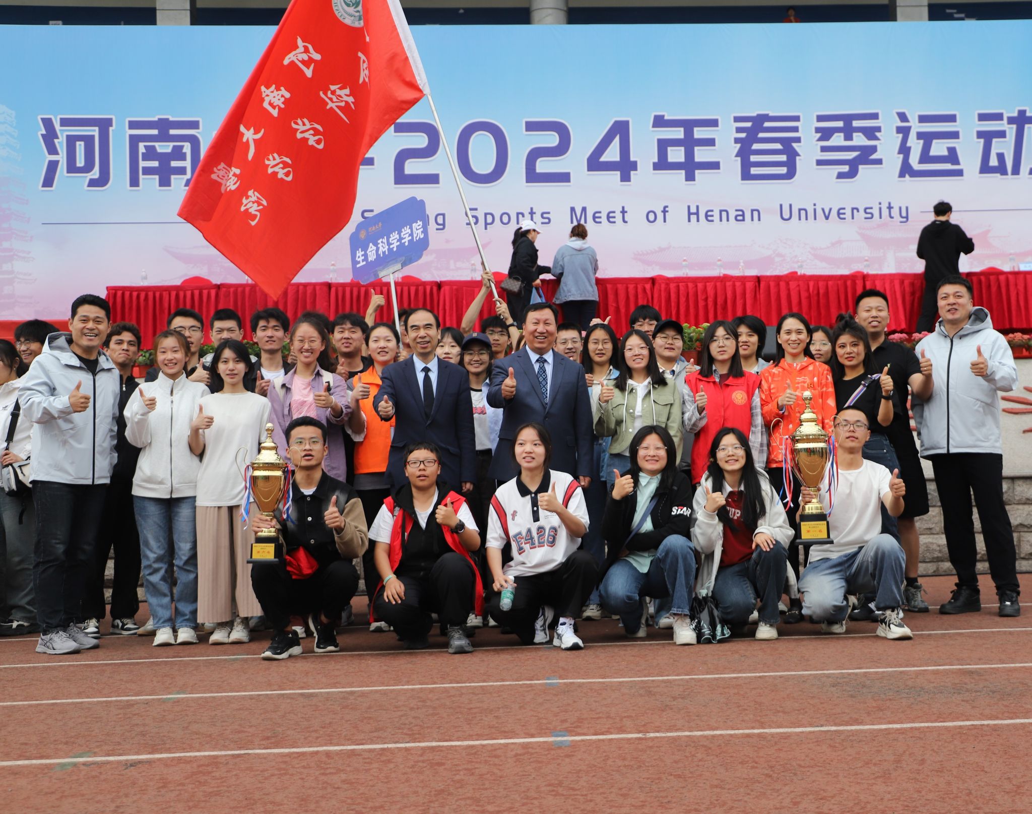 欢呼与拼搏交织,青春与热爱共燃。有这么一群人,心往一处想、劲儿往一处使,以昂扬拼搏的姿态逐梦赛场,不断突破自我,共创生科荣耀。在河南大学2024春季运动会闭幕式上,生命科学学院荣获教职工团体第一名、学生男子团体第六名。其中,教职工集体项目拔河、投壶,男子教职工四十岁以上3000米、男子学生组4×100米接力赛荣获全校第一的好成绩,振奋人心。