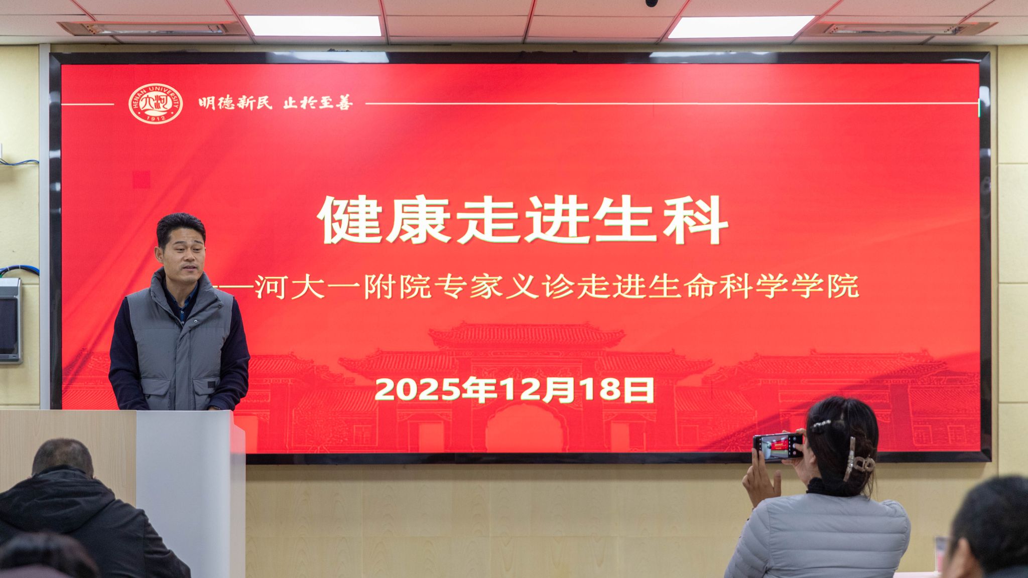 为提升教职工健康管理意识,加强关爱教职工行动,12月18日下午,河南大学第一附属医院健康义诊活动在B101教室举行,在健康管理科主任、工会副主席耿盛男的带领下,医院多个科室负责人携手走进生命科学学院,吸引了众多教师积极参与。活动由学院党委副书记宋永鹏主持。