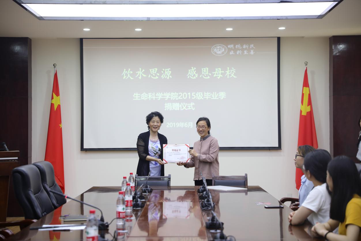 捐赠仪式上,2019届辅导员吴会芳代表2019届全体本科毕业生向母校捐款450元,校友工作与教育发展基金会办公室主任刘波接受捐款,并颁发捐赠纪念证书。