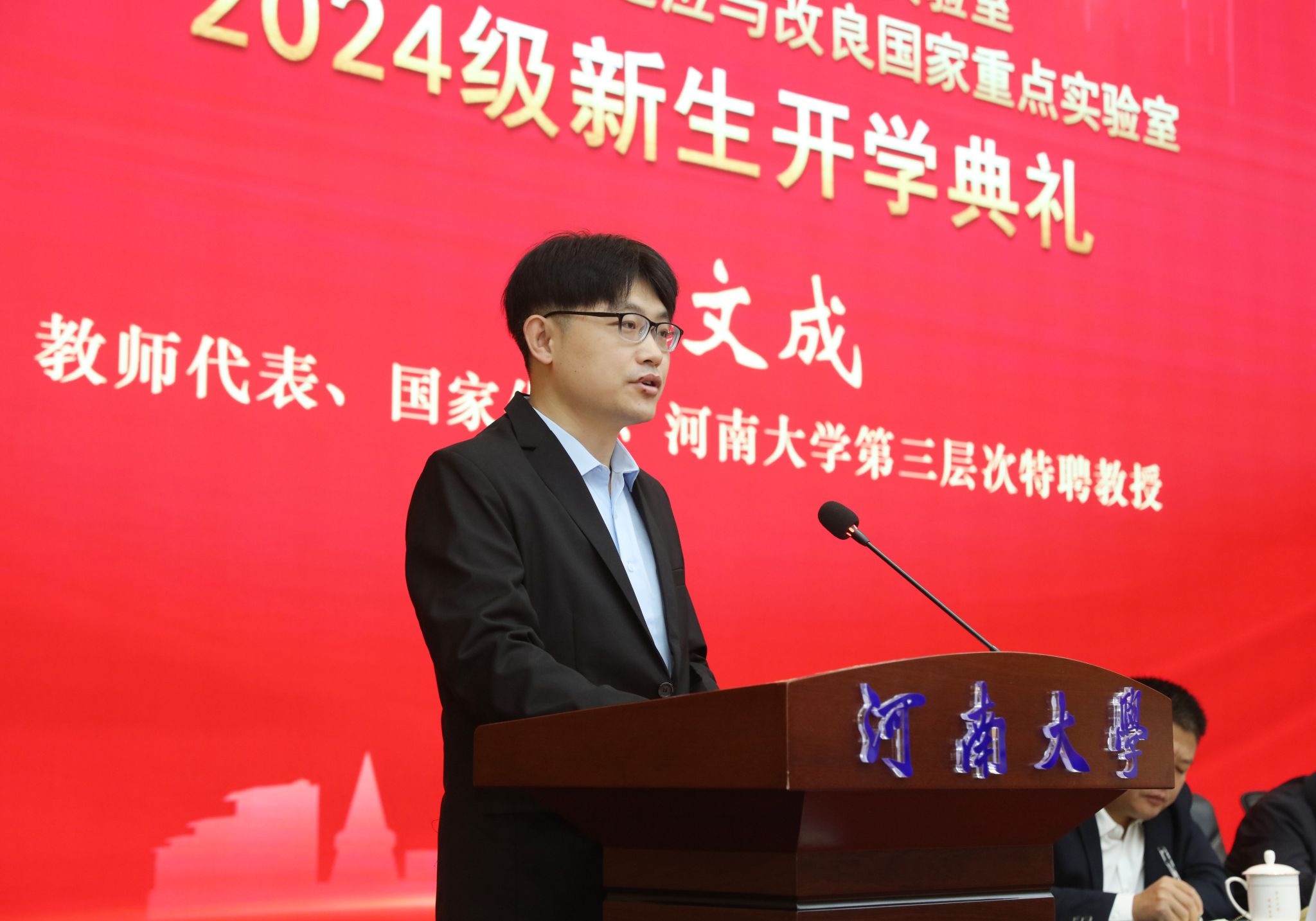 河南大学副校长、生命科学学院院长张立新教授致辞。他代表学院、重点实验室向2024级新同学表示热烈欢迎。他讲到,河南大学正处在国家“双一流”、河南“双航母”战略发展期,确立了创新发展的办学新目标、新思想、新精神,每一位河大人在机遇和挑战中追寻实现梦想的奋斗路径,传承创新,奋力拼搏。他强调,生命科学学院自1987年重建以来,经过一代代生科人的团结奋斗实现了跨越式发展,生物学科从“一个课题,两个老师,三间房子”的艰苦创业,到两次入选世界一流学科,形成了先进的学术思想和独特的学术体系,成为全国领域内的后起之秀。他希望同学们要心怀祖国、勇挑重担,牢记为中华民族伟大复兴而奋斗的使命,努力成为祖国栋梁;要珍惜时光、自律自省,怀抱梦想又脚踏实地,敢想敢为又善作善成;要持续发力、坚持创新,树立对一流创新成果的追求,以具体应对焦虑,以笃定应对变化,以经历应对迷茫,以创新应对未来。