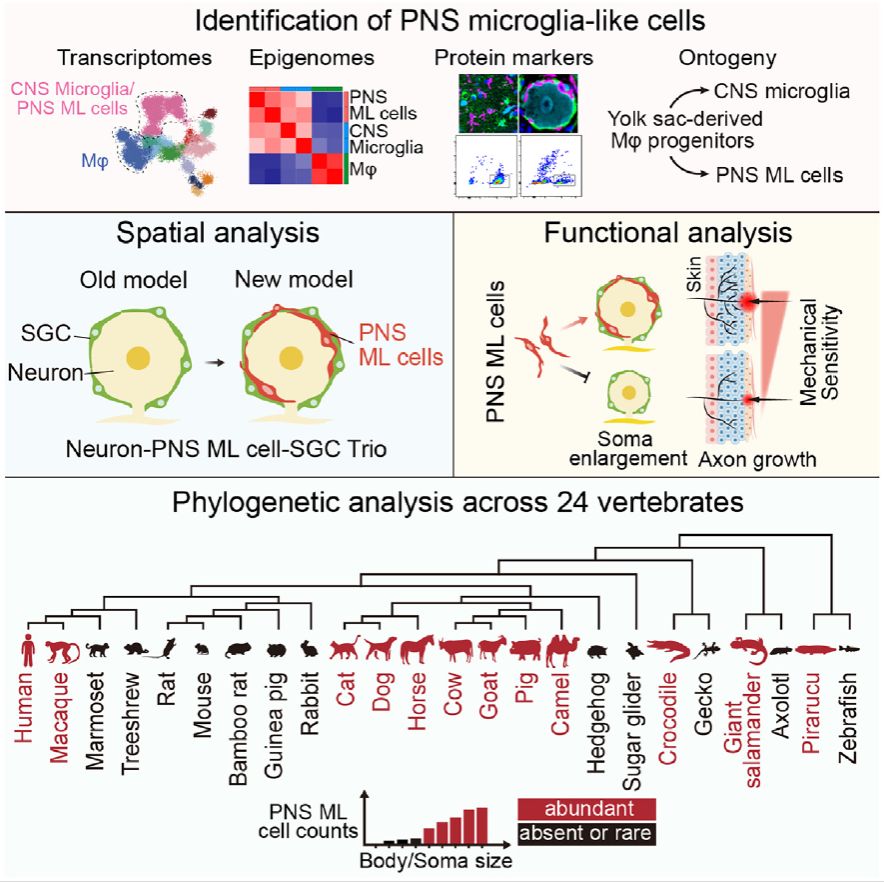 自1919年小胶质细胞被发现以来,科学界普遍认为其仅存在于中枢神经系统。在李汉杰研究员的指导下,孙华所在团队通过跨物种单细胞转录组测序、表观组学及系统演化分析,首次在外周神经系统中鉴定出与中枢小胶质细胞同源的新型免疫细胞,并揭示了其调控神经元胞体增大、轴突生长及功能成熟的关键作用。这一发现不仅改写了教科书内容,更为探索慢性疼痛、周围神经病变等疾病的机制提供了全新视角。