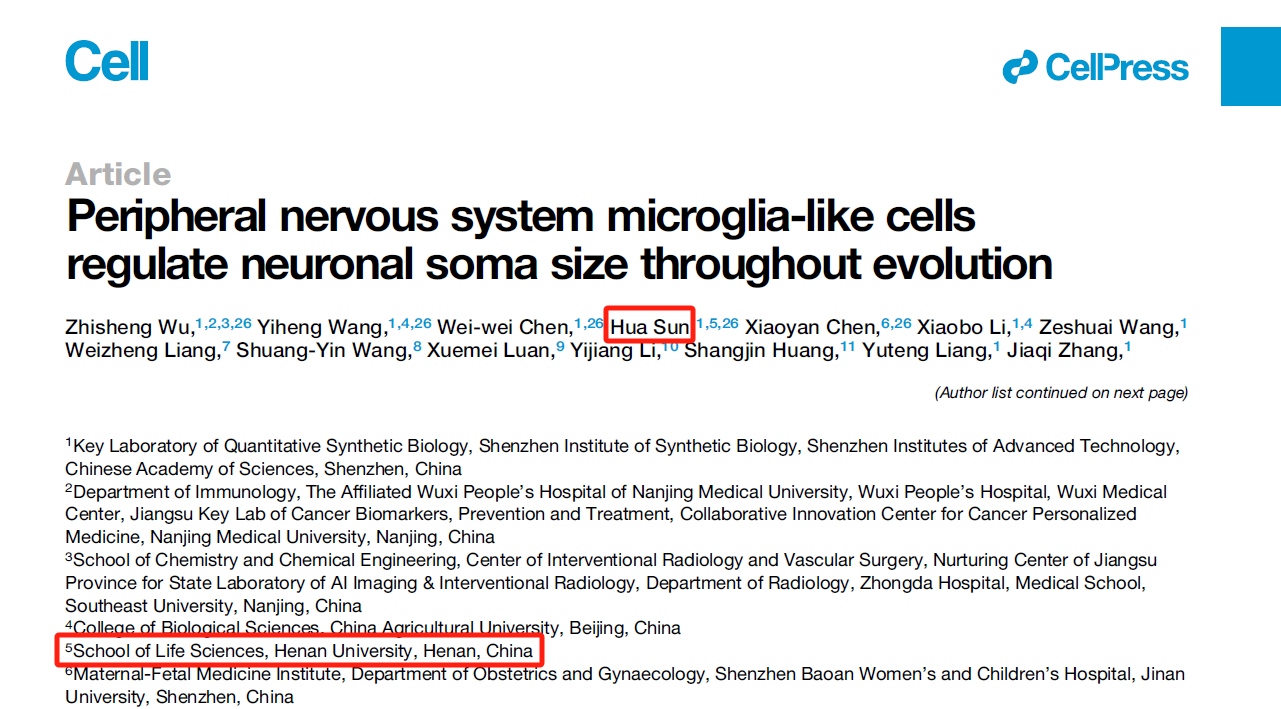 近日,国际顶级学术期刊《Cell》在线发表了题为《Peripheral nervous system microglia regulate neuronal soma size throughout evolution》的研究论文。该研究首次证实了外周神经系统存在一类新型免疫细胞——外周神经系统小胶质细胞(PNS microglia),颠覆了神经科学领域长达百年的传统认知,为神经免疫交互机制及外周神经系统疾病研究开辟了新方向。开云kaiyun网页版官网与中国科学院深圳先进技术研究院联合培养的硕士研究生孙华作为共同第一作者参与此项研究,开云kaiyun网页版官网为论文共同署名单位。