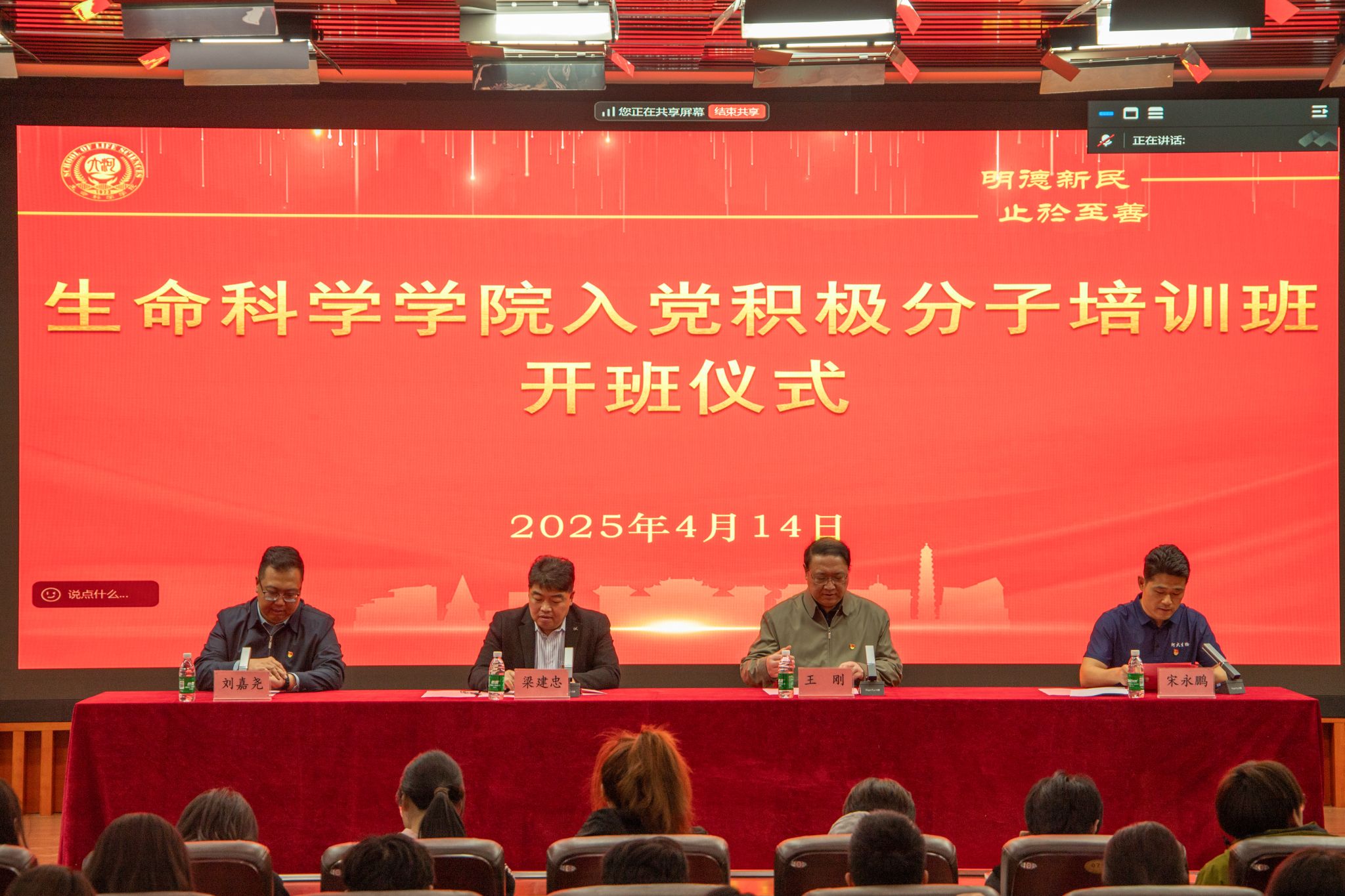 4月14日,开班仪式在生命科学学院圆楼报告厅三楼举行,马克思主义学院副院长刘嘉尧,生命科学学院党委书记梁建忠和执行院长王刚参加开班仪式,仪式由学院党委副书记宋永鹏主持。