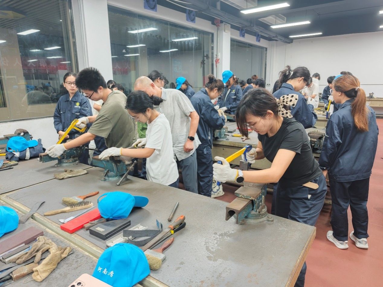根据不同专业特色和培养目标,构建梯度化、多元化的实践教学体系。6月25日-7月4日,2024级生物工程专业58名学生在黄河水利职业技术大学开展为期10天的金工实习,前5天为钳工实习,学生在专业教师指导下学习划线、锯削、锉削、钻孔等基础操作,于反复实践中打磨耐心与精准度。在后5天的车工实习中,学生在机械加工实操中感受劳动的科学性与技术性,深刻领会“工匠精神、追求卓越”的专业理念。副院长赵海鹏在看望实习师生时讲到,要大力弘扬劳模精神、劳动精神和工匠精神,树立新工科理念和工科思维,为以后成为生物工程高技能人才和大国工匠打下坚实基础。