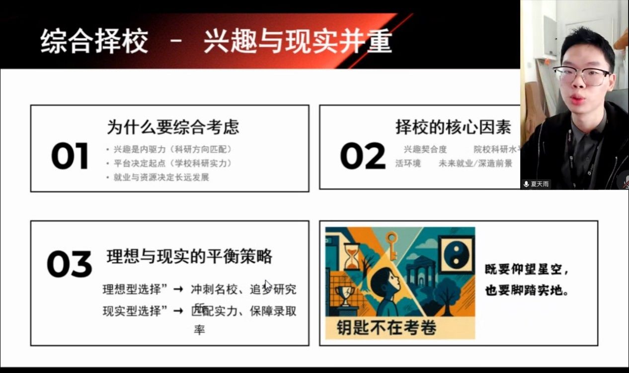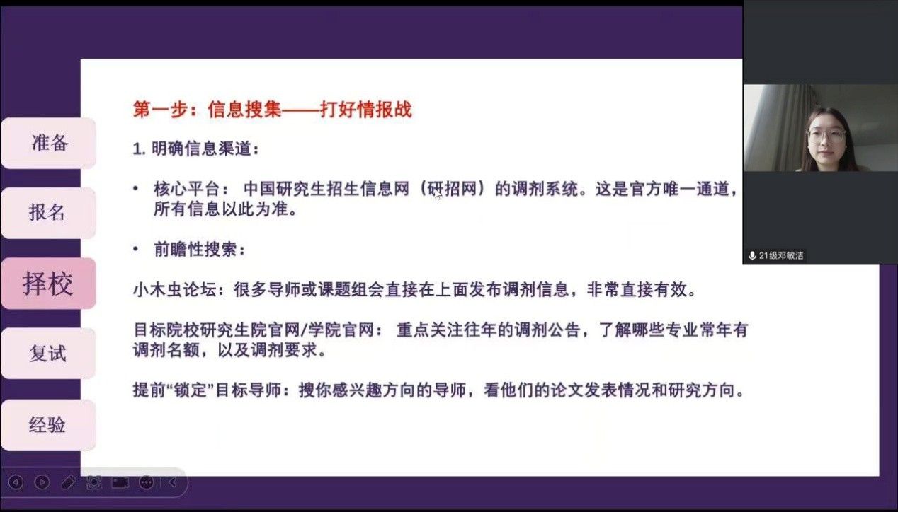 目前在上海植生所攻读博士学位的明德班2023届毕业生夏天雨同学围绕报考院校与导师选择、城市区位等多个方面分享了报考经验,并分享了自己的备考经验。目前就读于四川大学的邓敏洁同学系统讲述了从院校筛选到复试准备过程中各个环节的注意事项,她提醒学弟学妹们不仅要“了解信息”,更要“讲好自己”,注重表达能力的锻炼。今年考取作物逆境重点实验室的苏方聪同学则结合各科目的考试准备和复试技巧分享个人体会,为同学们提供了切实可行的备考建议。