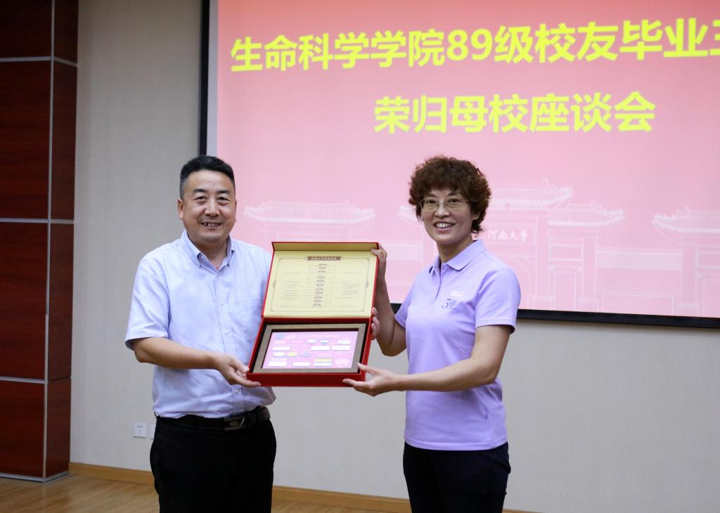 89级校友向学院捐赠纪念汴绣,祝愿学院勇攀高峰,取得更大成就。吴建伟代表学院向89级校友送上河南大学校徽套装,寄托了母校对大家诚挚的祝福。