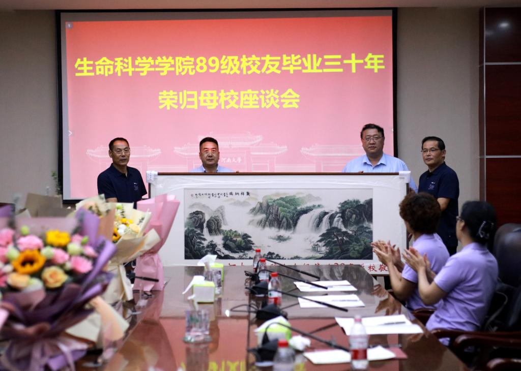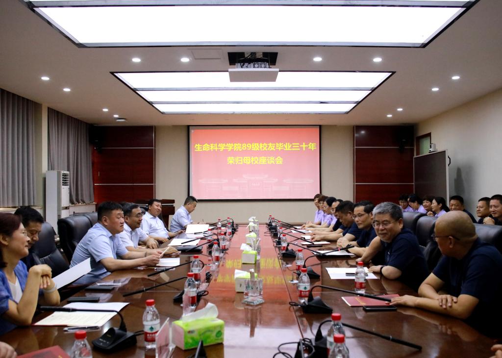 7月21日下午,河南大学生物系89级校友毕业30年返校座谈会在学院B201会议室举行。河南大学原校长宋纯鹏,89级辅导员、河南农业大学副校长尚富德,河南大学副校长、生命科学学院院长张立新,河南大学副校长苗雨晨,开封市政协副主席苗琛,学院党委书记吴建伟,执行院长王刚及教师代表参加座谈会。会议由89级毕业生、棉花生物育种与综合利用全国重点实验室/省部共建作物逆境适应与改良国家重点实验室常务副主任安国勇主持。