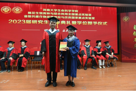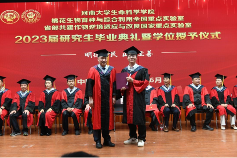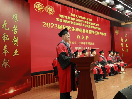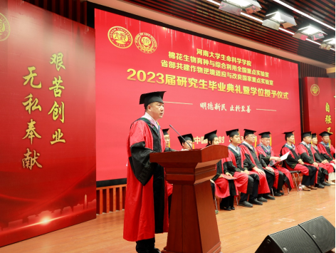 6月29日下午,生命科学学院2023届研究生毕业典礼暨学位授予仪式在学院圆形报告厅举行。河南大学副校长、生命科学学院院长张立新、学院党委书记吴建伟、执行院长王刚、棉花生物育种与综合利用全国重点实验室主任周树堂、省部共建作物逆境适应与改良国家重点实验室/棉花生物育种与综合利用全国重点实验室常务副主任安国勇以及学院全体领导班子、学位评定分委员会成员、家长代表、教师代表以及2023届全体研究生毕业生参加典礼。典礼由吴建伟主持。
