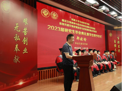毕业生郑梓威父亲、家长代表郑晓瑜代表在发言中表达了对学校、学院的感谢,感谢老师们为学生的成长用心良苦。他回顾了郑梓威在河南大学的求学经历,从迷茫、脆弱成长为胸怀大志、敢于承担责任,他感慨,看着孩子们成长为“出彩河大人”,是他们作为家长最大的幸福和骄傲。他鼓励毕业生们在人生的道路上勇往直前,牢记老师们的嘱托,保持积极的心态和追求卓越的精神,将在河南大学所学的知识与社会实践相结合,为社会作出应有的贡献。