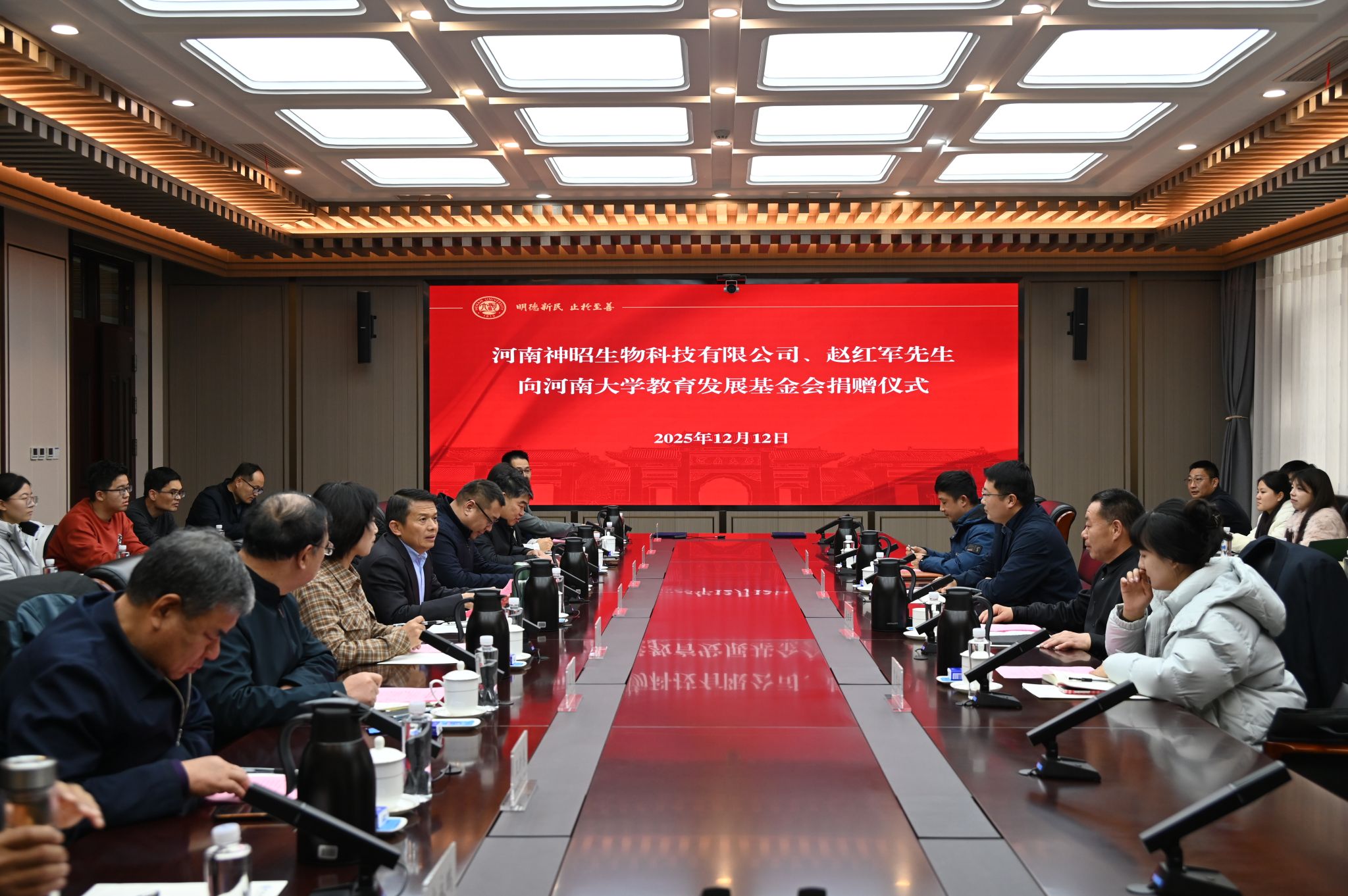 12月12日下午,河南神昭生物科技有限公司、赵红军先生(个人)捐赠仪式在郑州龙子湖校区友兰学堂中楼305会议室举行。河南神昭生物科技有限公司副总经理祖士江、采购总监谷庆民,个人捐赠代表赵红军,校党委书记季波,副校长、校友与教育发展基金工作部部长乔梁,教育发展基金会秘书长刘婷及研究生院、生命科学学院相关人员参加活动。仪式由生命科学学院党委书记梁建忠主持。