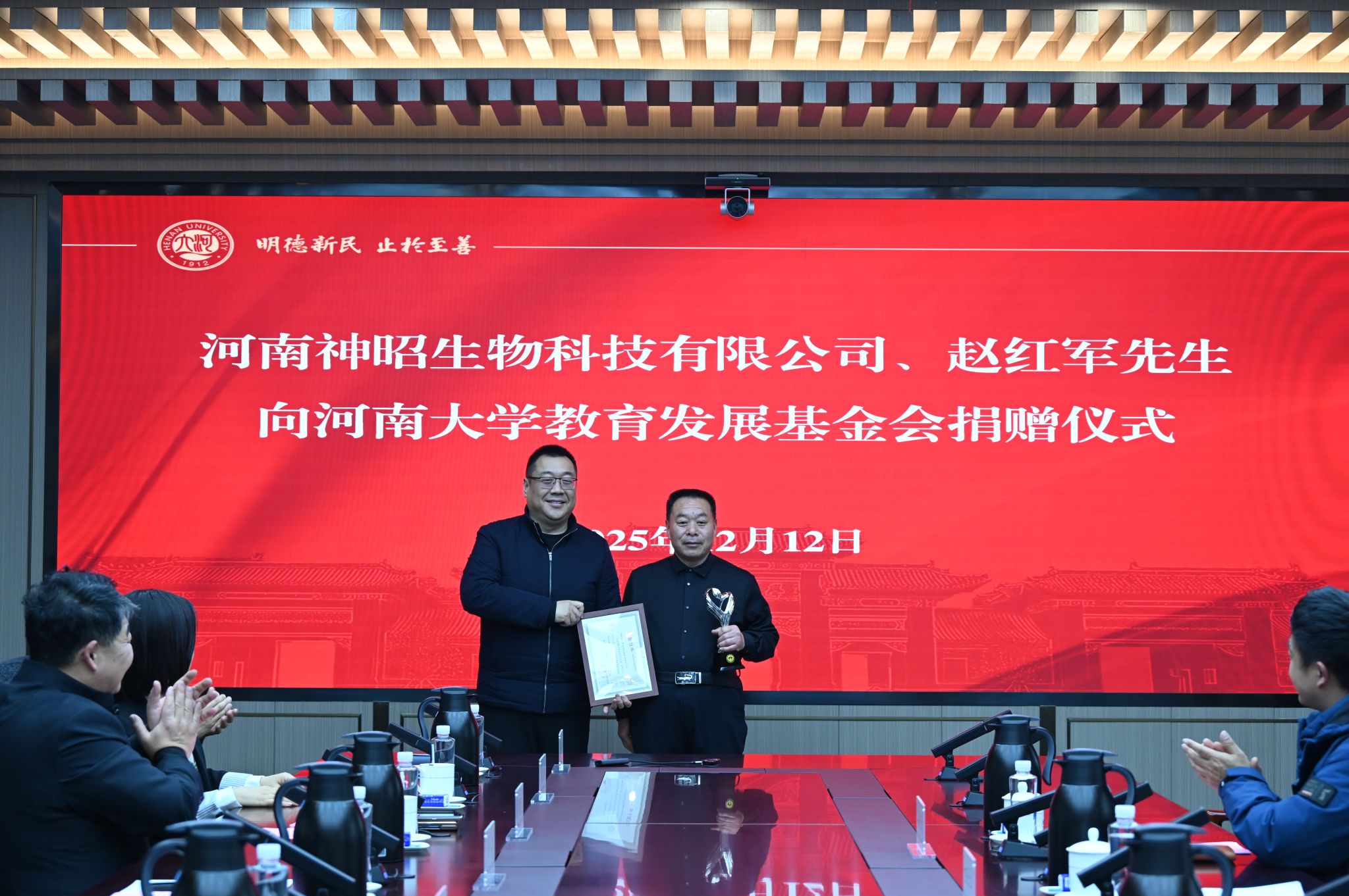 乔梁为捐赠方颁发捐赠证书及纪念杯。他在总结中指出,河南大学作为扎根中原大地的“双一流”建设高校,始终以服务国家战略需求为导向,以支撑区域经济社会发展为己任。近年来,学校通过动态优化学科生态体系,在生物医药、新型材料、人工智能等战略新兴领域形成特色优势,为高质量发展奠定了坚实基础。此次捐赠既是社会力量对学校办学方向的高度认同,更是推动产教融合的重要契机。他表示,期待通过校企深度融合,实现“需求对接、资源整合、优势叠加、成果共享”,为河南建设国家创新高地贡献智慧力量。