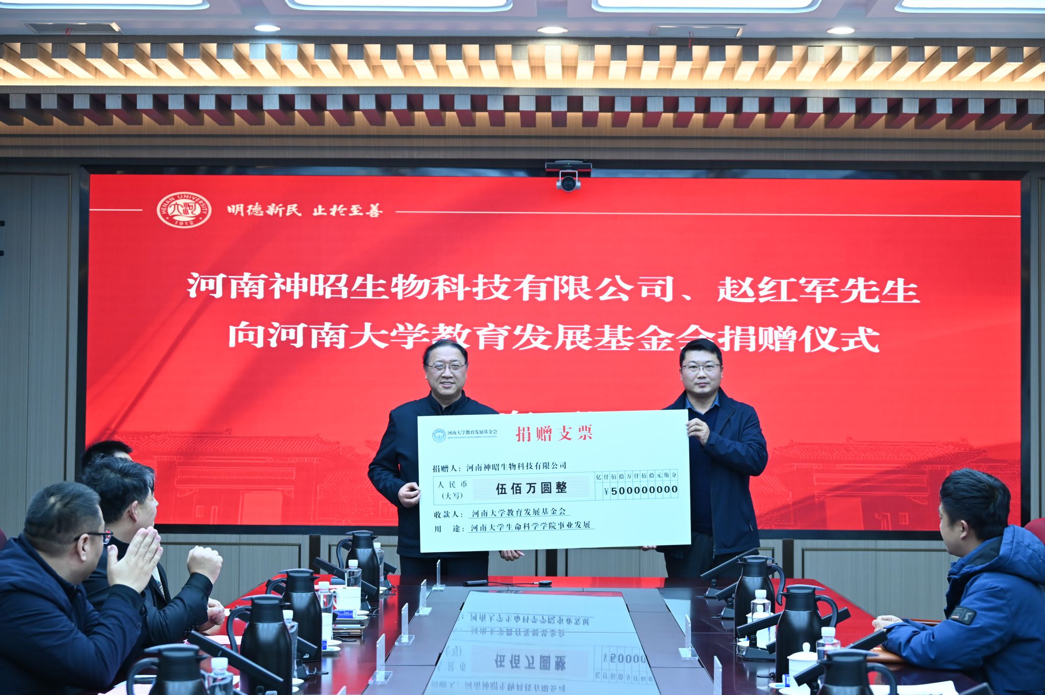 仪式上,刘婷代表河南大学教育发展基金会先后与河南神昭生物科技有限公司、赵红军先生签订捐赠协议,捐赠数额分别为500万元和300万元,王刚代表生命科学学院接受捐赠。
