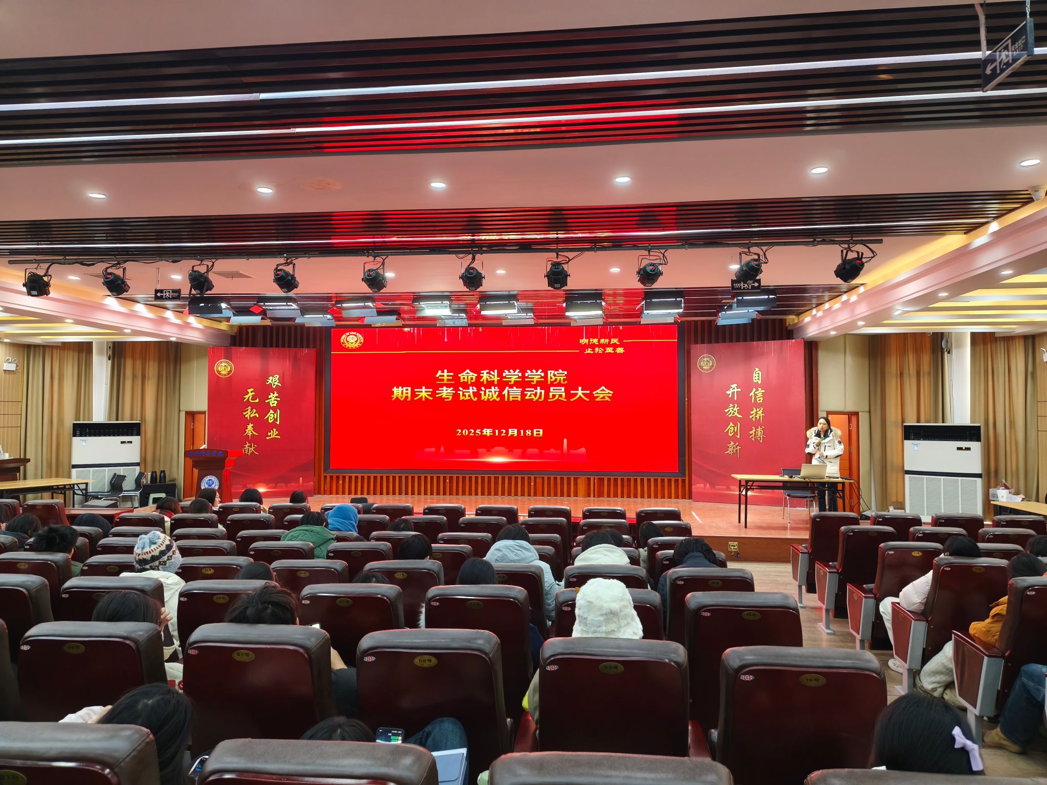为深入贯彻立德树人根本任务,进一步加强学风建设,严肃考风考纪,营造公平、公正、诚信的考试环境,近日,生命科学学院2024级本科生在圆形报告厅三楼召开以“诚信立身,严谨为学”为主题的年级诚信考试动员大会。年级辅导员张丽及2024级全体学生参加了本次大会。