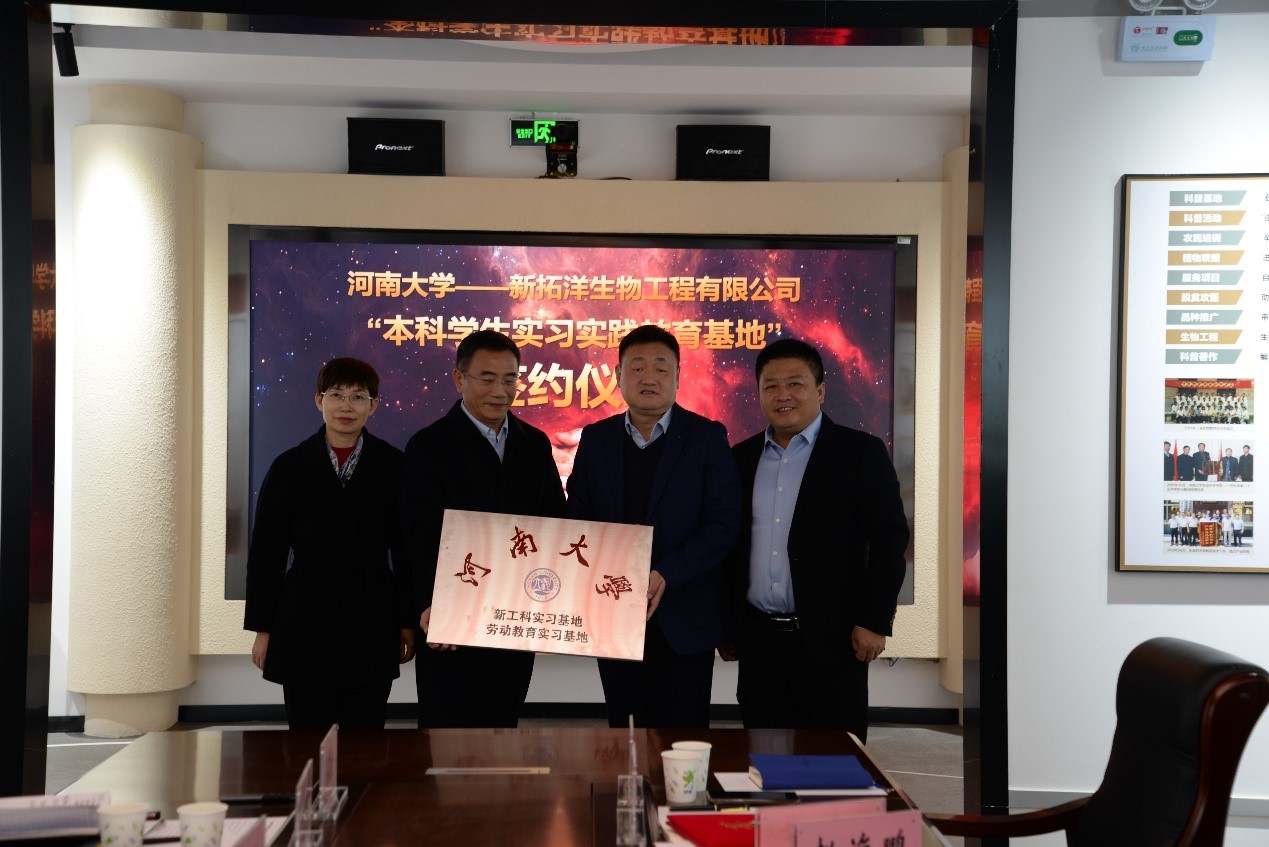 根据前期河南大学与新拓洋生物工程有限公司已达成的意向和签署的协议,秦天苍、陈黎、张立新、赵海鹏共同为生物工程专业新工科实习基地揭牌。