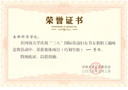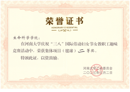 阳春三月,春光明媚。在这春暖花开之际,为庆祝“三八”国际劳动妇女节113周年,全面展示我校女教职工蓬勃向上、积极进取的精神风貌, 3月2日,河南大学庆祝“三八”国际劳动妇女节女教职工趣味竞赛活动在金明校区志义体育馆举行,生命科学学院积极组织全院教职工参加此次活动,最终荣获毽球集体项目二等奖、巧划旱船集体项目一等奖。