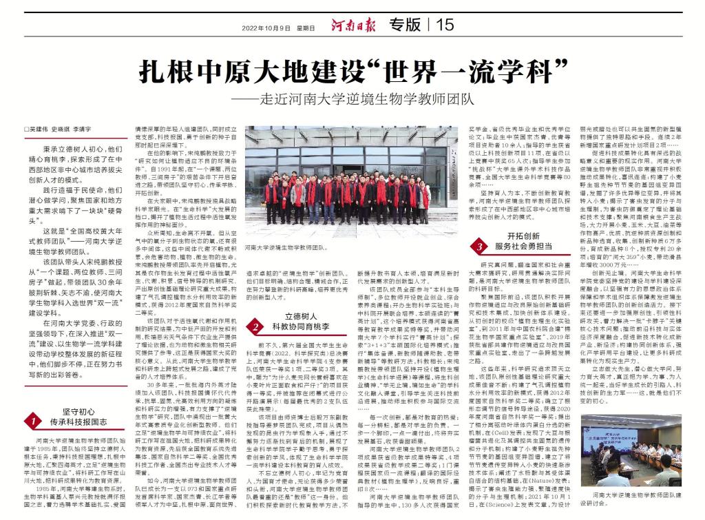 坚持育人为本,不断创新教育教学,河南大学逆境生物学教师团队探索形成了在中西部地区非中心城市培养拔尖创新人才的模式。