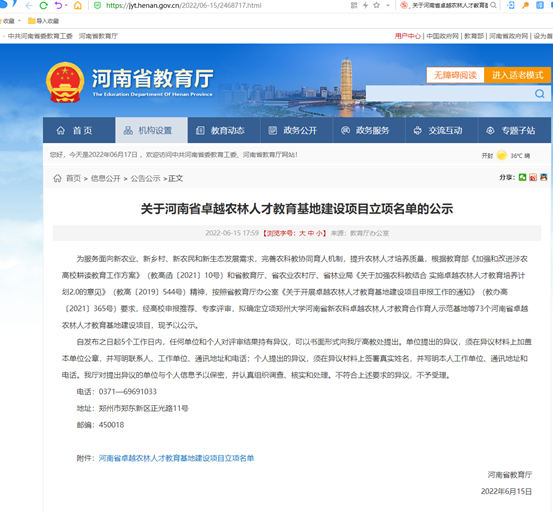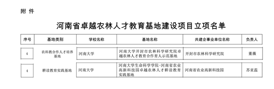 近日,河南省教育厅公布河南省卓越农林人才教育基地建设项目立项名单,我院董薇副教授主持的“河南大学开封市农林科学研究院卓越农林人才教育合作育人示范基地”、苏亚蕊副教授主持的“开云kaiyun网页版官网-河南省农业高新科技园卓越农林人才耕读教育实践基地”在列。这是生命科学学院植物科学与技术专业获批国家级一流专业建设点后,在专业建设方面取得的又一重要成绩。